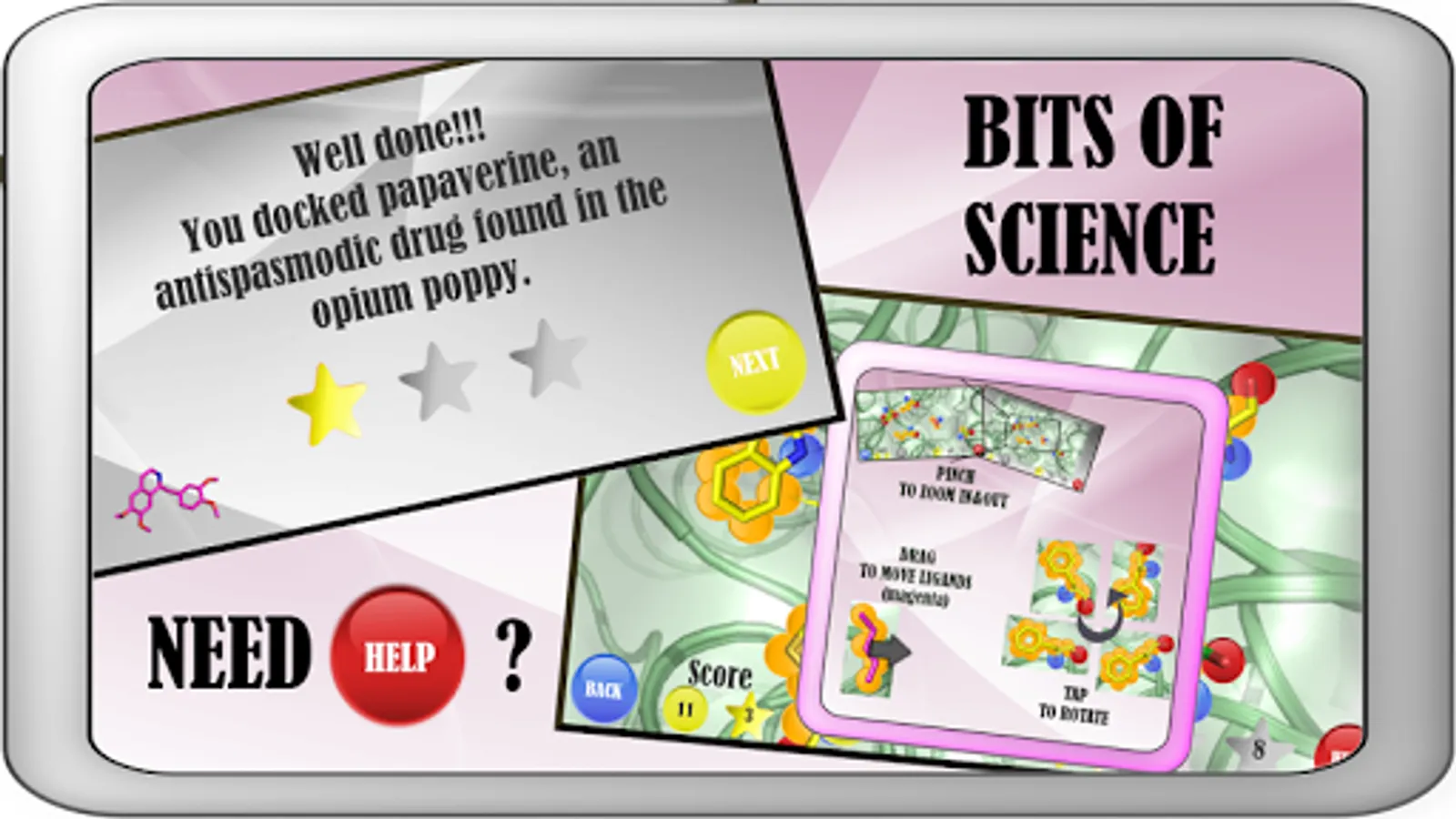 Chemistry Docking with its attractive graphic and unique design, mixes scientific concepts with casual gaming elements. The chemical structure of the drugs and the protein is fused with a simple representation that emphasizes what kind of interactions each part can establish.