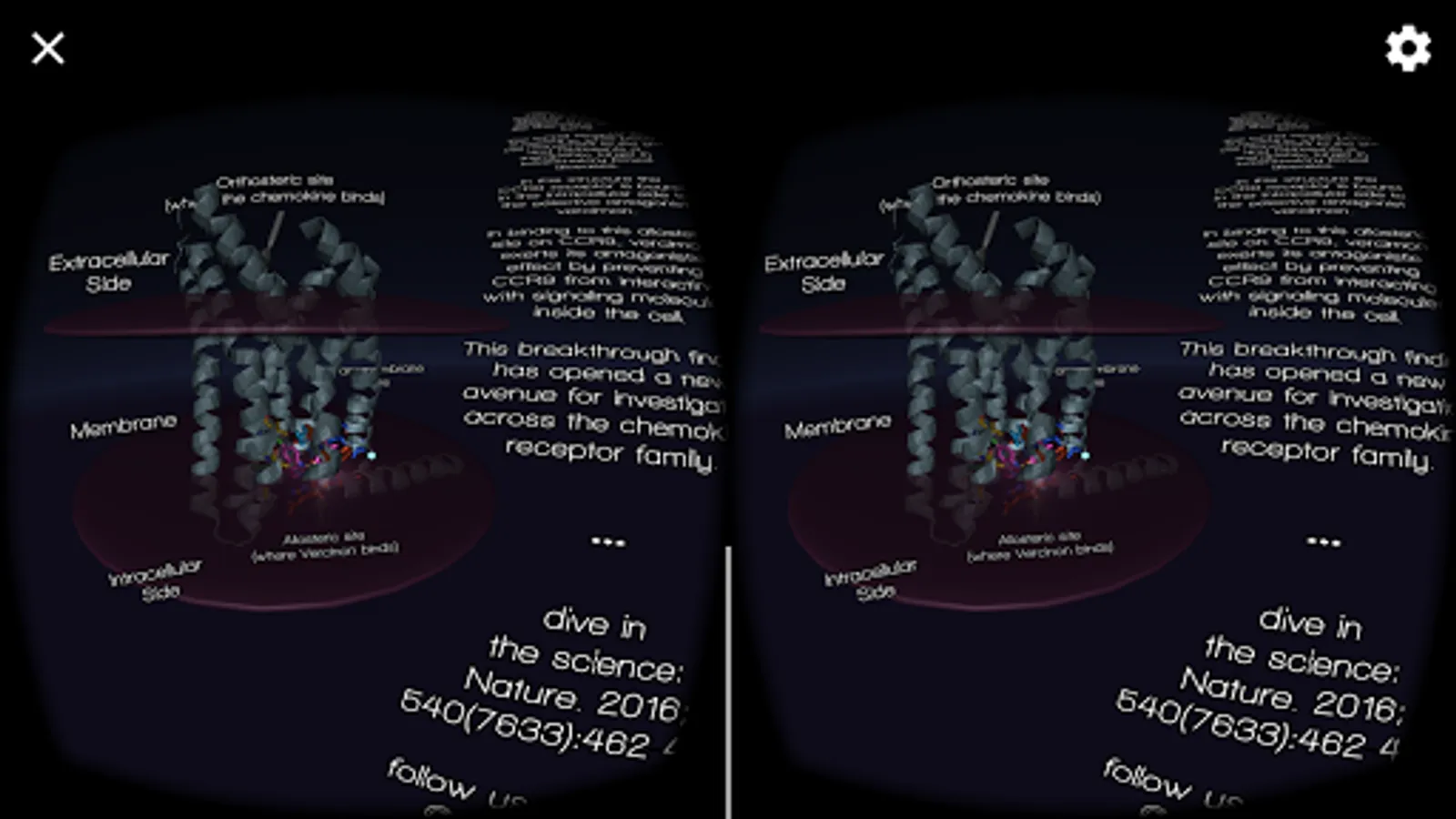 MoleculE 2 VR includes 3D information derived from X-ray crystal structure data solved by Heptares Therapeutics scientists (Intracellular allosteric antagonism of the CCR9 receptor. Nature. 2016 Dec 15;540(7633):462-465)