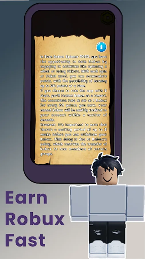 Don't miss the opportunity to earn Robux by playing our game! All you need to do is spin the wheel or open a ticket. Having fun and earning Robux has never been this simple! No need to pay any fees. Our game "Easy Robux Spinner" not only entertains you but also rewards you with Robux prizes. Start playing right now and enjoy the benefits of Robux!
