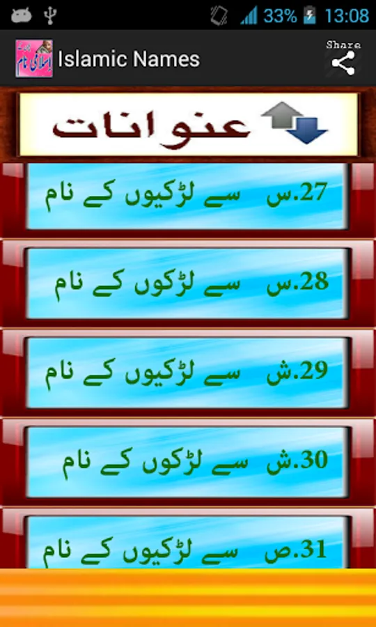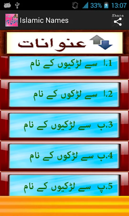 Go to the Menu and select option from the list alphabetically. This App only contains unique Islamic names. You can also find the language origin, meaning in Urdu and English phrase of desired names.