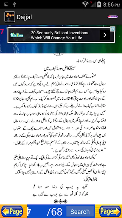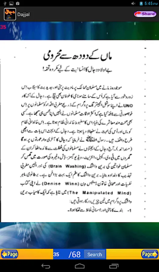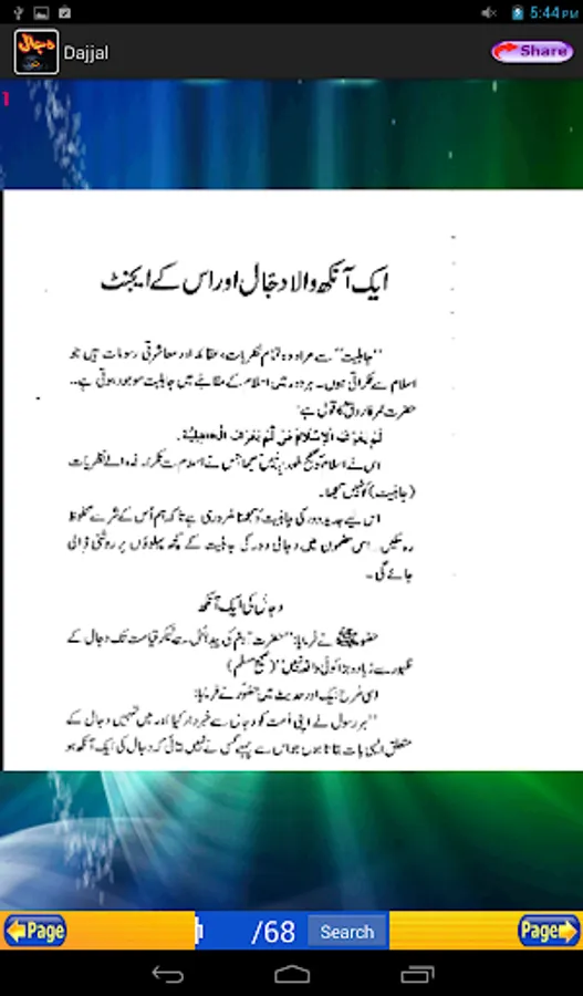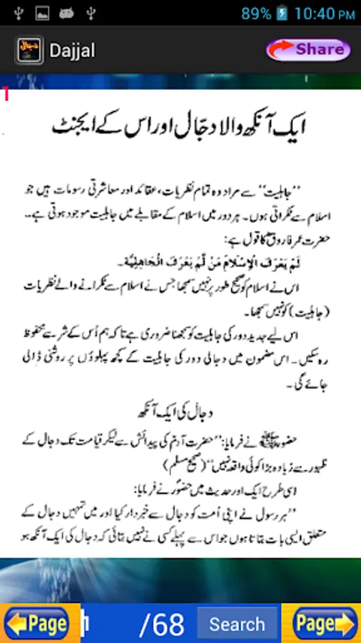 Aik Ankh Wala Dajjal: This is an application that uncovers the secretes of the Dajjal. It covers Dajjal's complete history in depth. This is an Urdu application for Urdu readers. This application has over 68 pages of information regarding the coming of Dajjal.