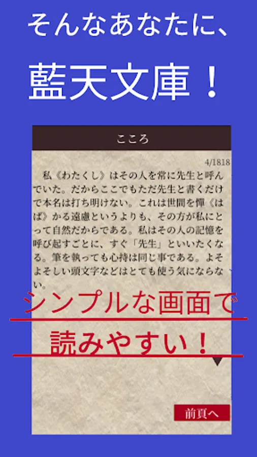 Aiten Bunko is displayed character by character like the text of a game, and is designed so that the smartphone screen is not filled with characters.
