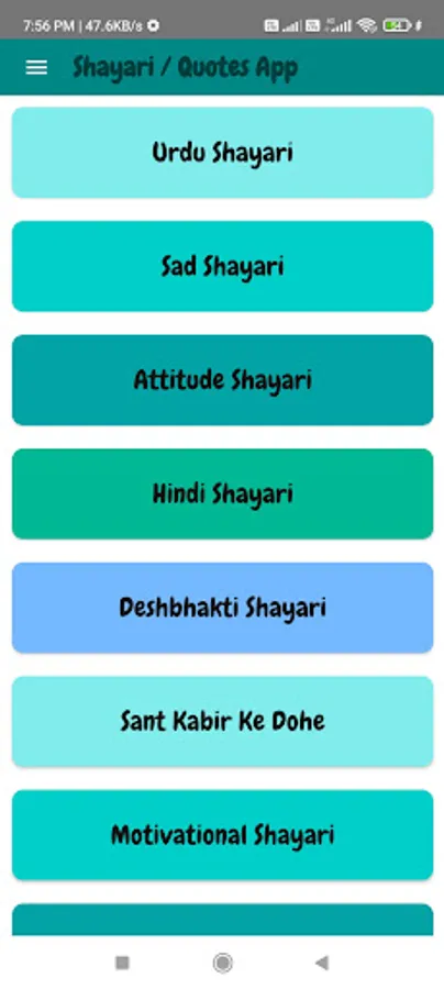 Collection of 1000 + Shayari and Quotes across various categories such as attitude shayari , romantic shayari , love shayari , Hindi dohe , motivational shayari , funny shayari and many more .