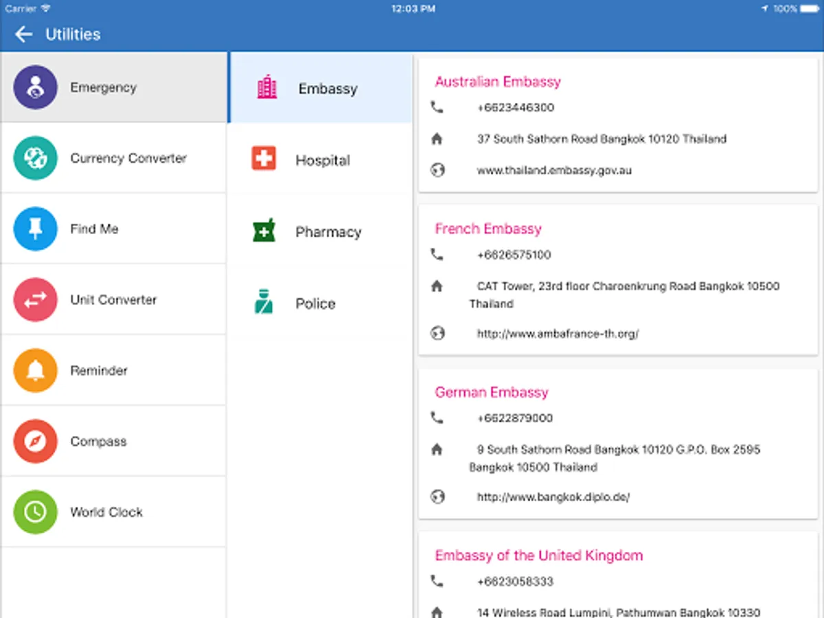 • Travel utilities like hotel booking, currency converter, weather forecast, world clocks, reminder, alarm and many more available within the app.