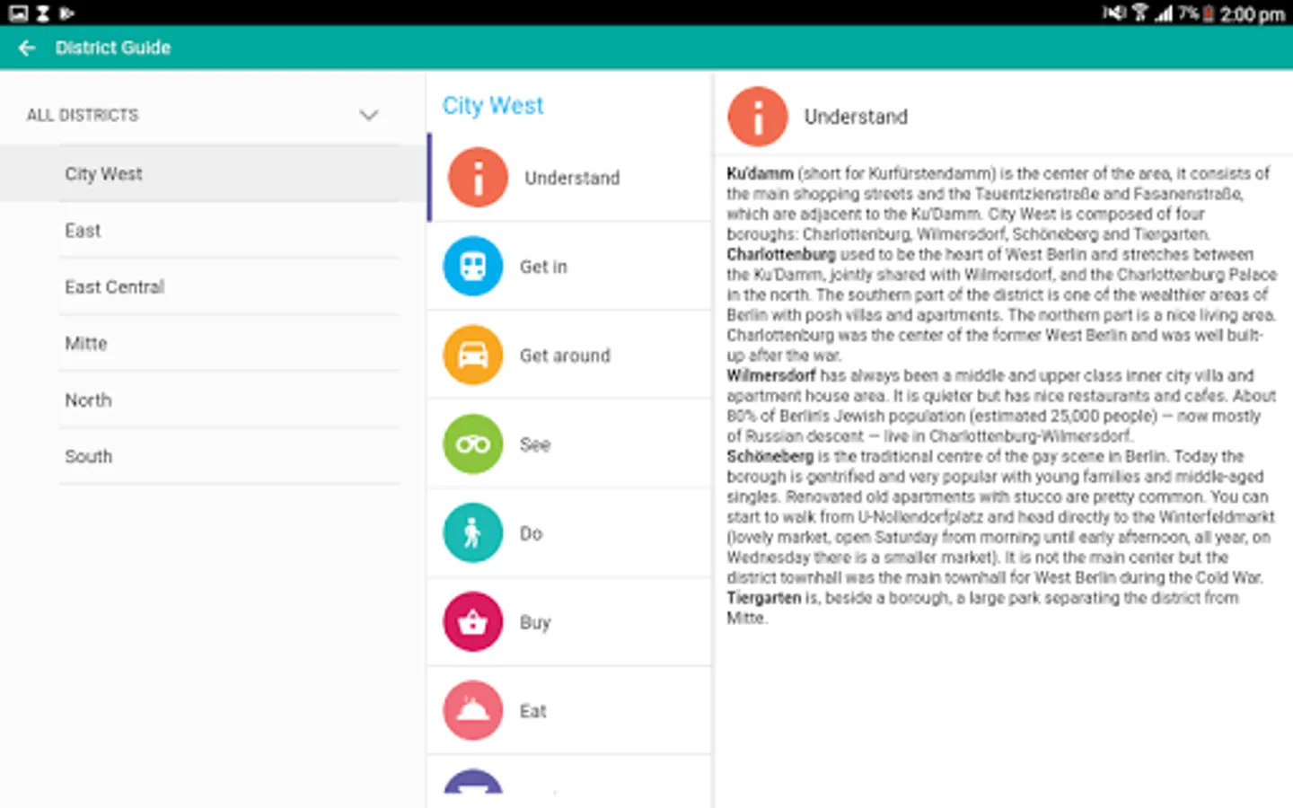 • Practical travel guide with detailed information like attractions, getting around for each district of Berlin City.