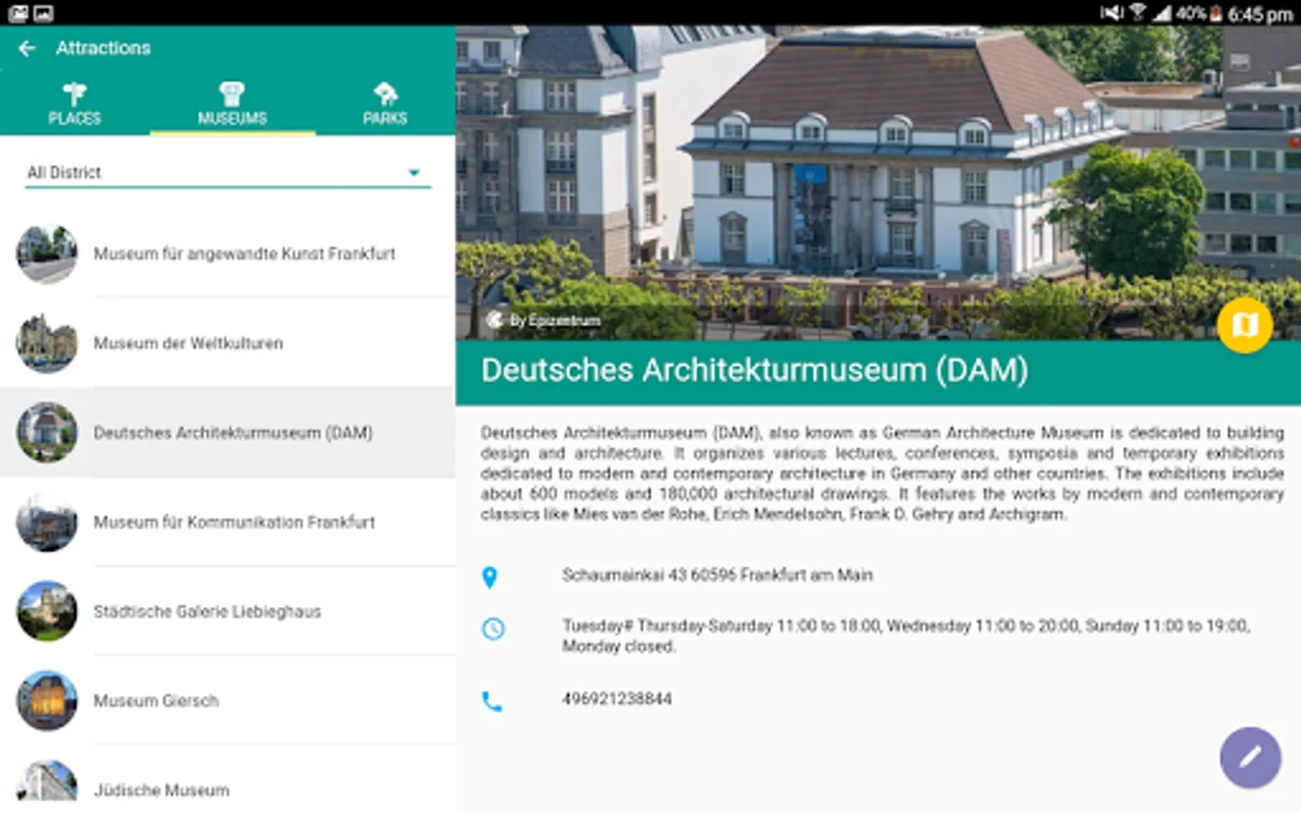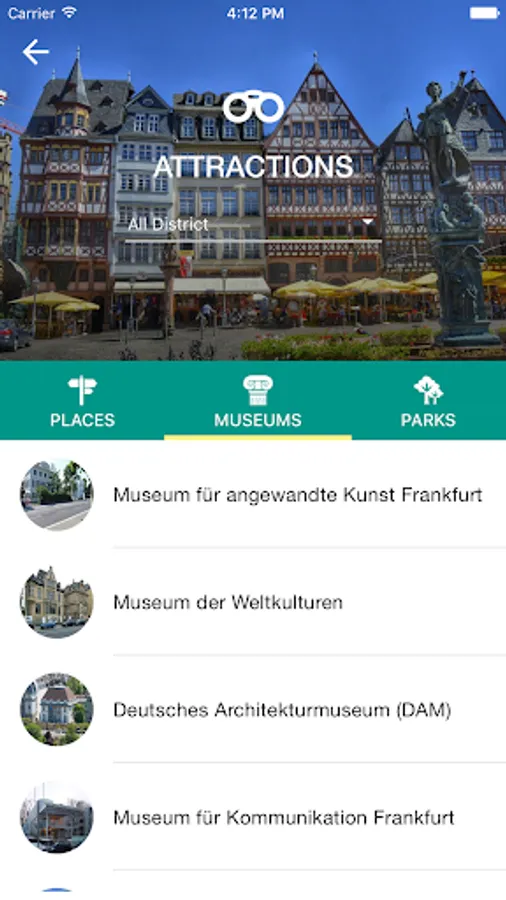 • Practical travel guide with detailed information like attractions, getting around for each district of Frankfurt City.