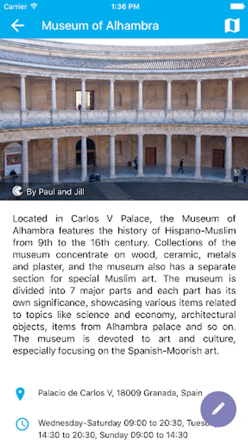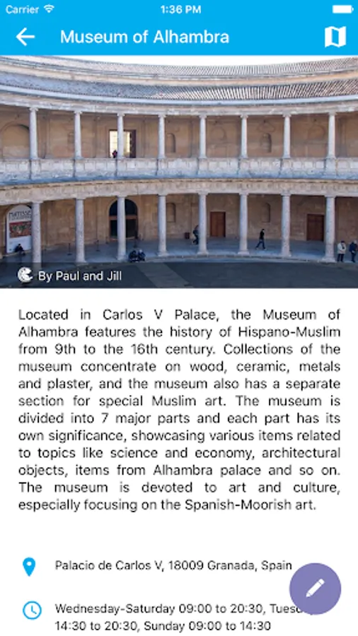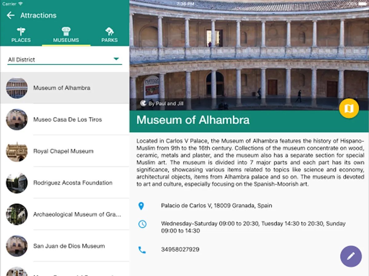 With detailed information of around 10 museums and 30 featured attractions along with 1000s of other Points of Interest carefully integrated with every single travel activity, Granada travel is power packed with utilities and information. From Facebook Check-Ins to local event information, offline map to intuitive Augmented Reality experience, we have brought most of the travel activities and application needs to one single app. Save precious travel time rather than switching between several apps and utilities!