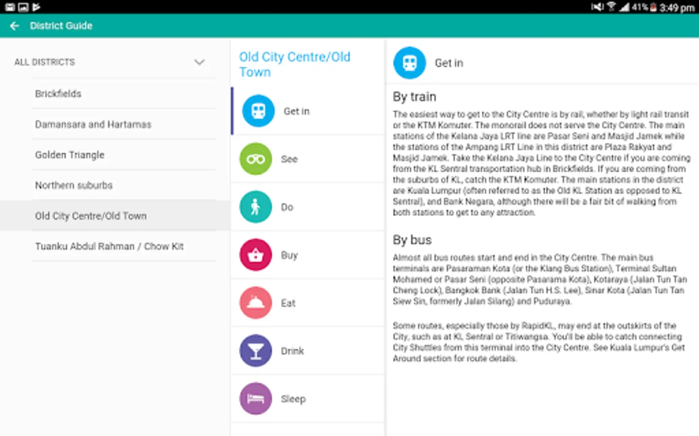 • Practical travel guide with detailed information like attractions, getting around for each district of Kuala Lumpur City.