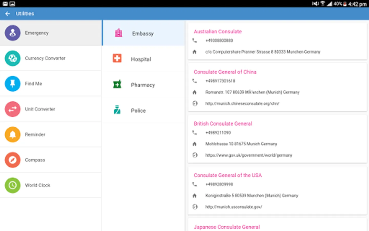 • Travel utilities like hotel booking, currency converter, weather forecast, world clocks, reminder, alarm and many more available within the app.