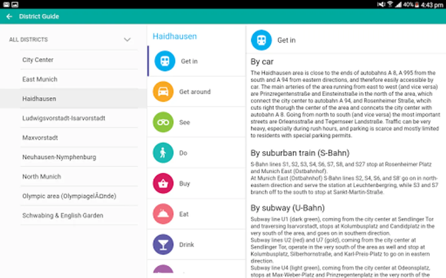 • Practical travel guide with detailed information like attractions, getting around for each district of Munich City.