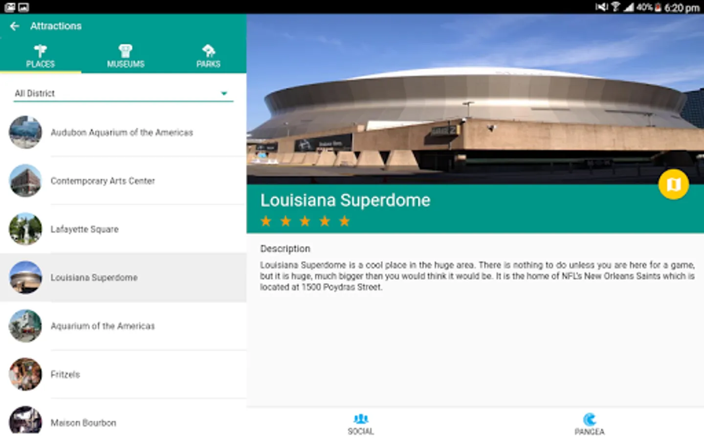 With detailed information of around 10 museums and 90 featured attractions along with 1000s of other Points of Interest carefully integrated with every single travel activity, New Orleans Travel - Pangea Guides is power packed with utilities and information. From Facebook Check-Ins to local event information, offline map to intuitive Augmented Reality experience, we have brought most of the travel activities and application needs to one single app. Save precious travel time rather than switching between several apps and utilities!
