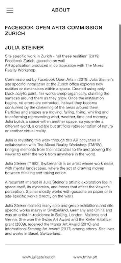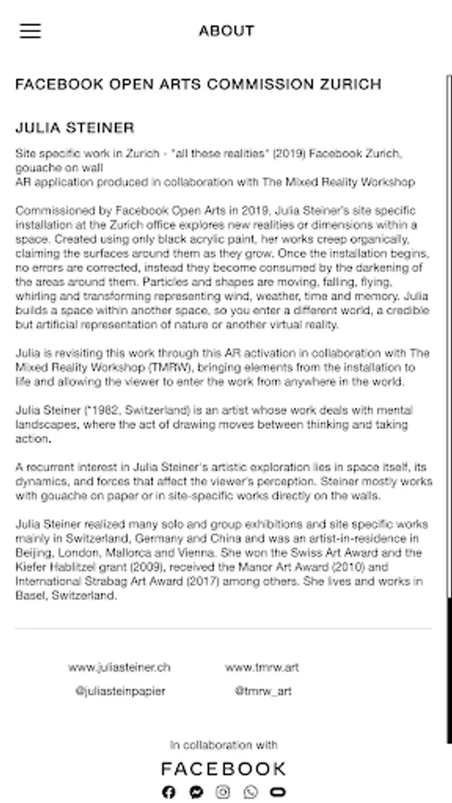 Commissioned by Facebook Open Arts in 2019, Julia Steiner’s site specific installation at the Facebook/Oculus Zurich office explores new realities or dimensions within a space. Created using only black acrylic paint, particles and shapes move, fall, fly, whirl and transform representing wind, weather, time and memory. Created in collaboration with The Mixed Reality Workshop (TMRW), Julia has revisited this artwork through this AR activation bringing elements from the installation to life and allowing the viewer to enter the work from anywhere in the world.