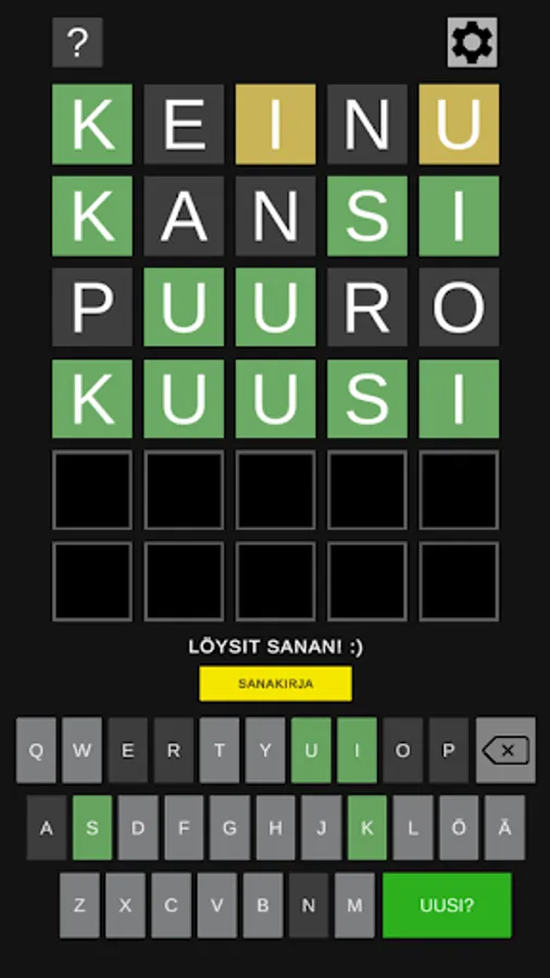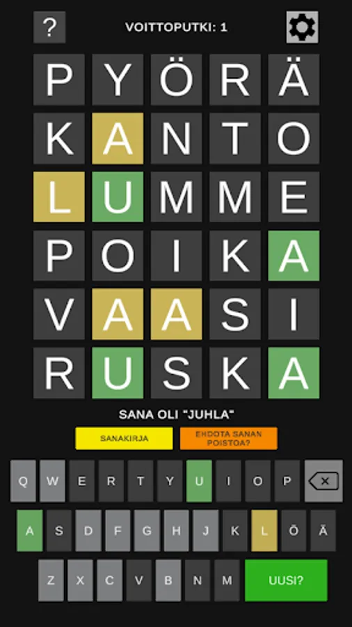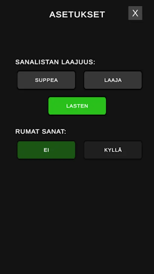The word set works for parents, young people and children alike. The game can be made more difficult and easier by changing the word list, which contains either the full Kotus word list, the facilitated version, or the children’s version, which contains only the easiest child-friendly words.