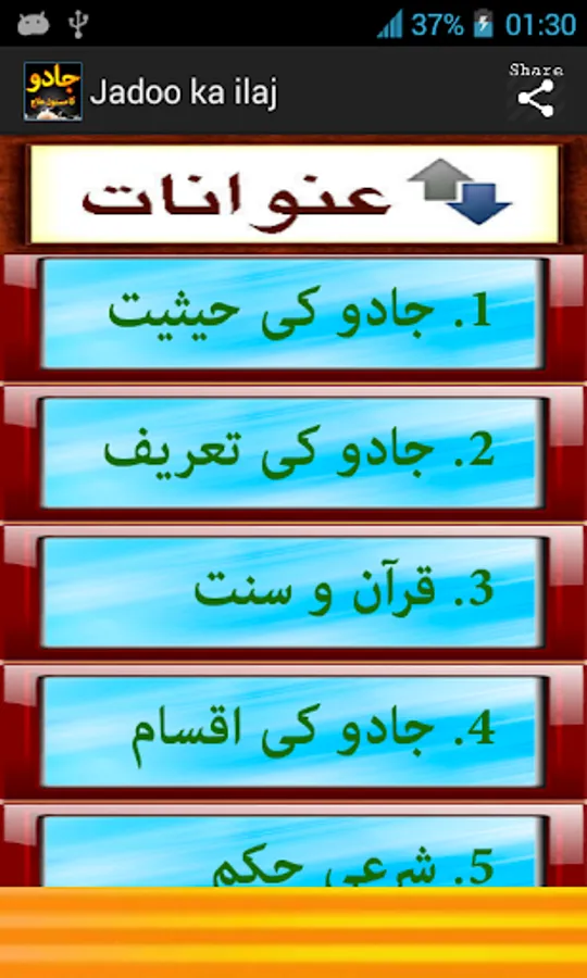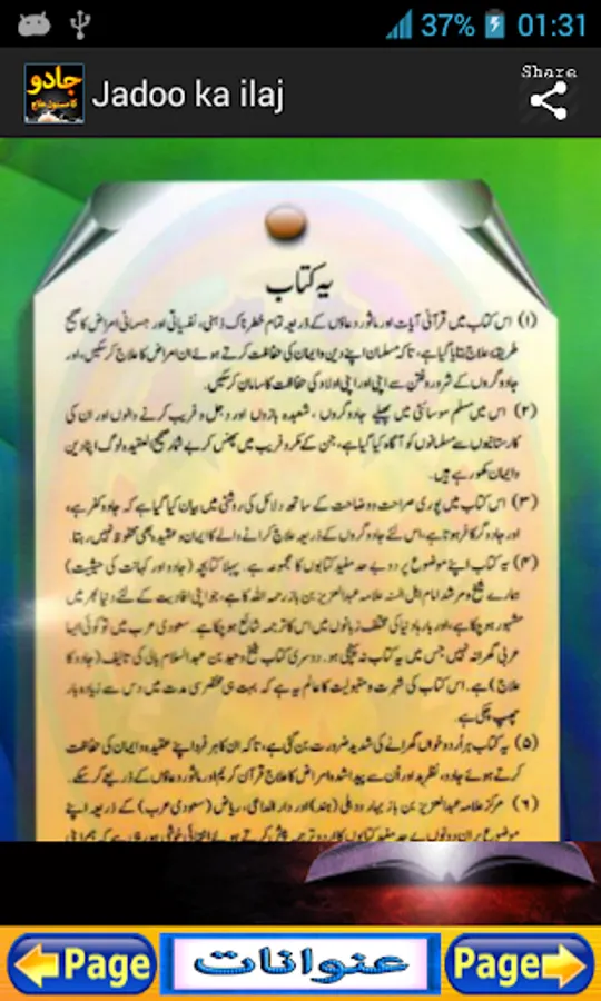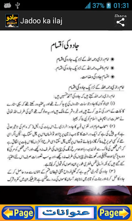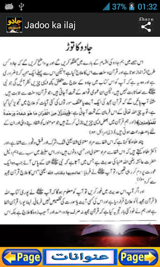 Jadoo Ka Ilaj Complete App for all Muslim users worried do to jadoo, toony, and Taweez. A complete guide for every Muslim to get protected from Black Magic ( Kala Jadu ). This Book App also contains references from The Holy Quran and Hadees. All Information in this Application is very authentic so feel free to use because this book is written in the context of Quran and Hadees.