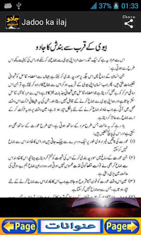 This App also describe the remedy of kala jadu. Kala Jadu is worst ever form of jadoo. Kala jadu us more evil and more dangerous. By performing simple Islamic rituals and prayer everyone can cure kala jadoo .