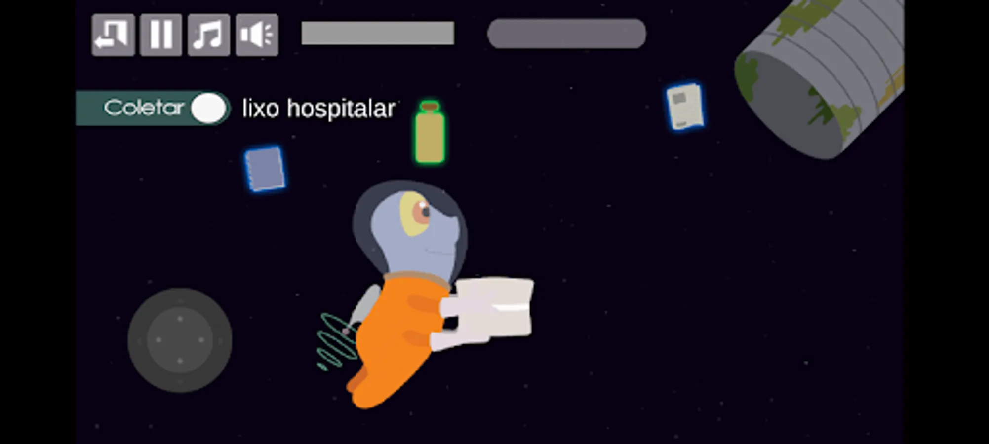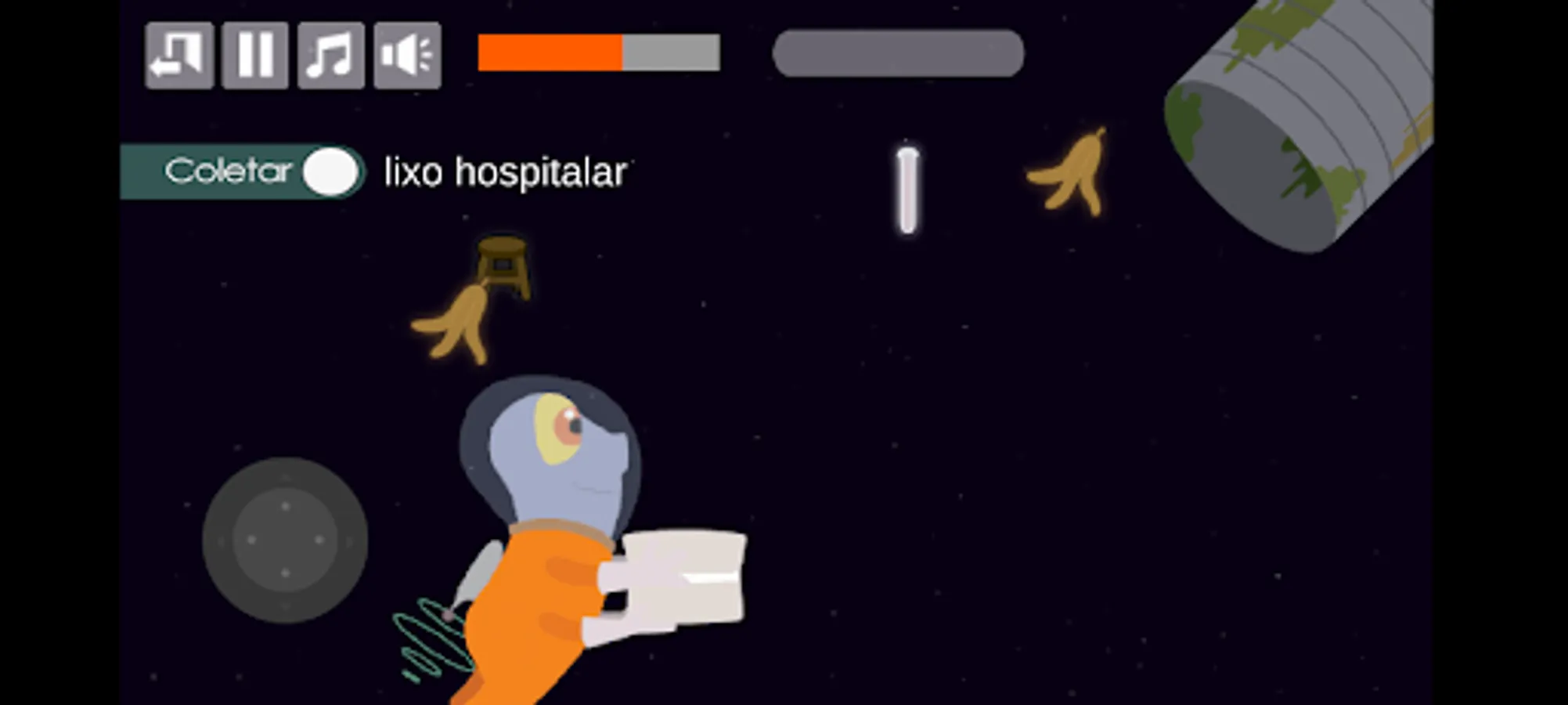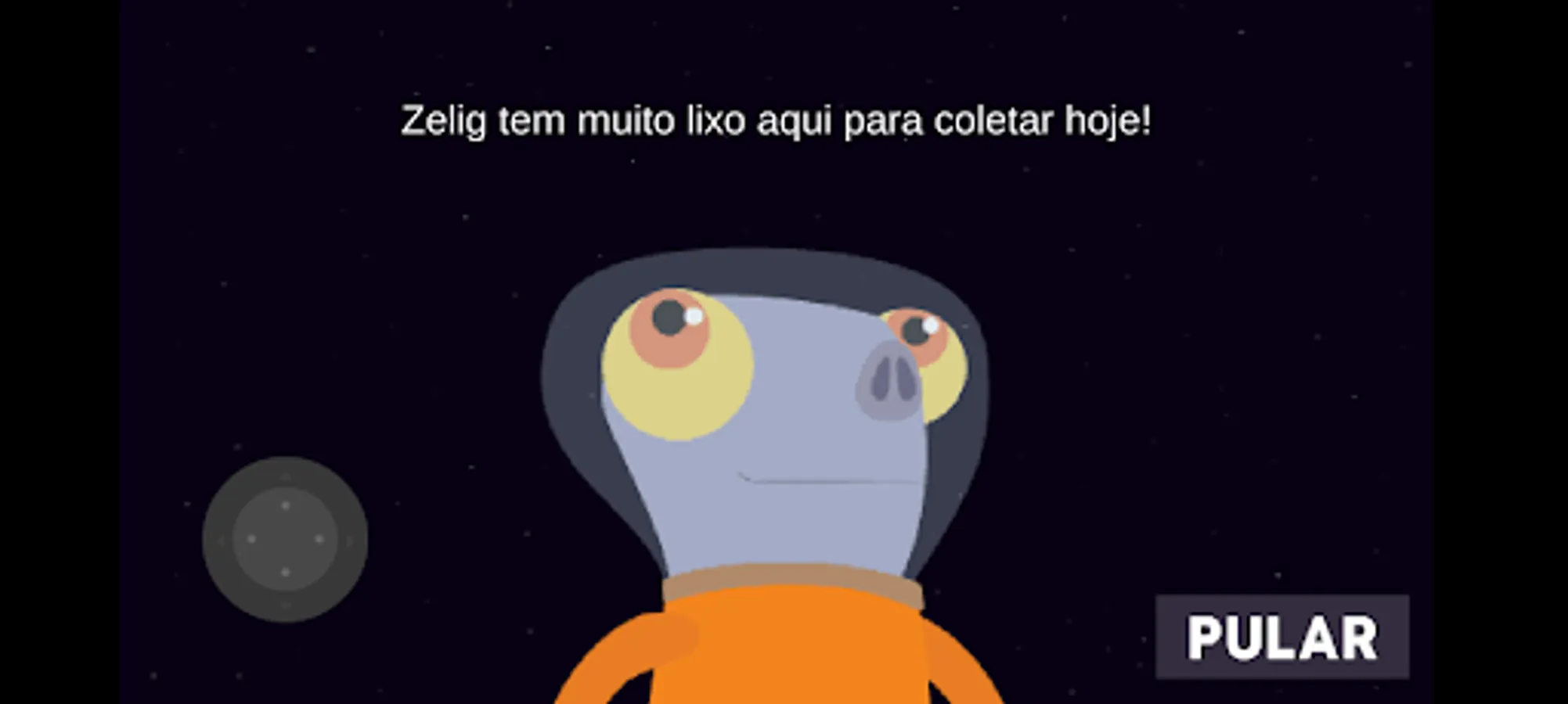Zelig is a very helpful extraterrestrial who works by collecting the garbage that comes up in his sector. The objective of the game is to help Zelig, by controlling his movements, to collect the type of garbage required by the game. The game presents a bar, which is filled with each correct garbage that the player collects, when he fills the bar, he is required to collect another type of garbage. When the player collects metal, glass, plastic, paper, wood, medical waste and organic waste, the game is over.