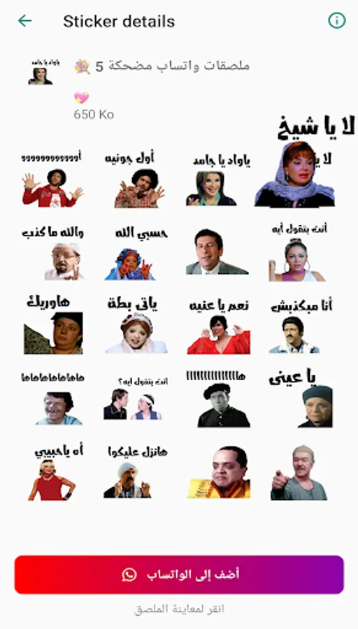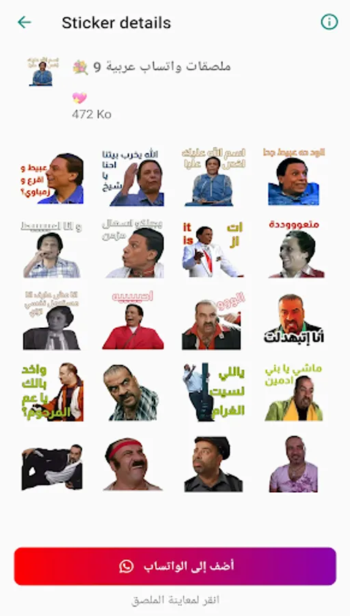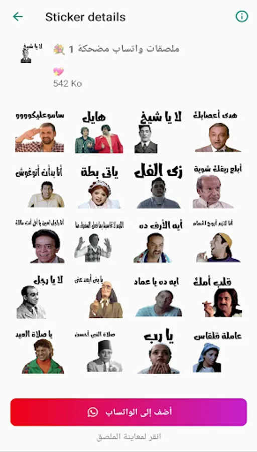 Funny WhatsApp stickers contain many famous and funny faces and phrases from some movie and series characters such as El Lumpy and Bab Al Hara