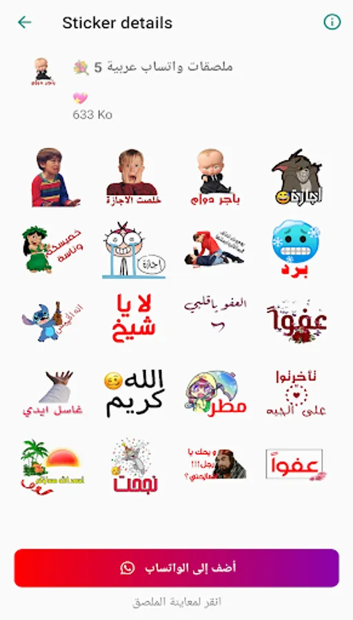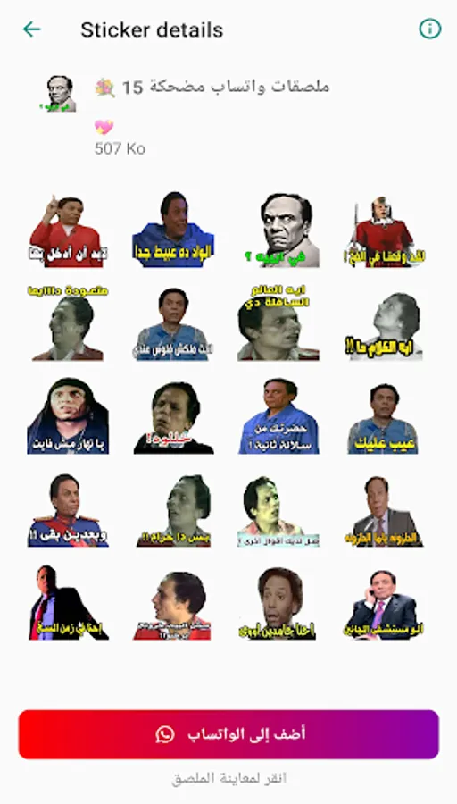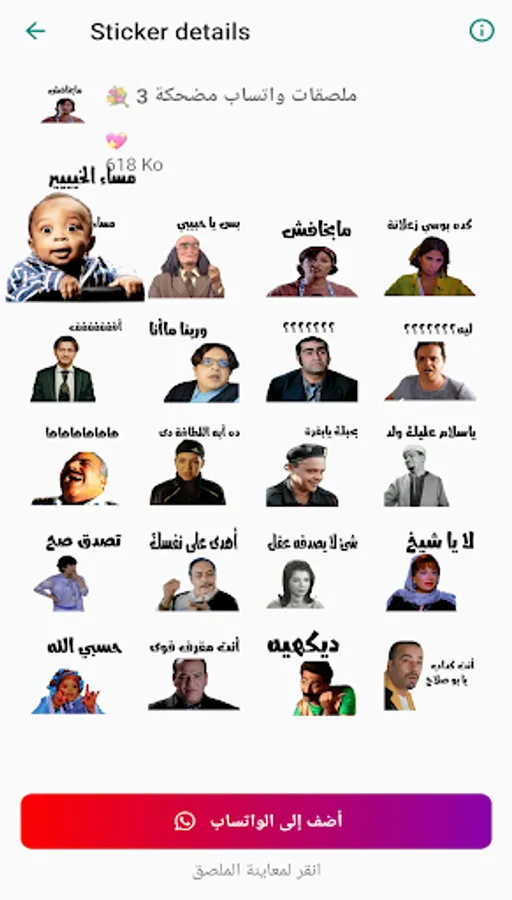 The program contains a lot of funny stickers and posters, and laughing comic stickers for WhatsApp, such as: funny WhatsApp stickers that contain many famous and funny faces and phrases, play stickers (Adel Imam, the big children, Al-Wad Sayed Shaghal), Egyptian stickers (Mohamed Saad, Al-Lambi) Gulf posters (Tash Ma Tash, Nasser Al-Qasabi, Abdullah Al-Sadhan) and many more! If there are any suggestions for stickers that you would like to see in the next updates, please contact us and we will work on that.