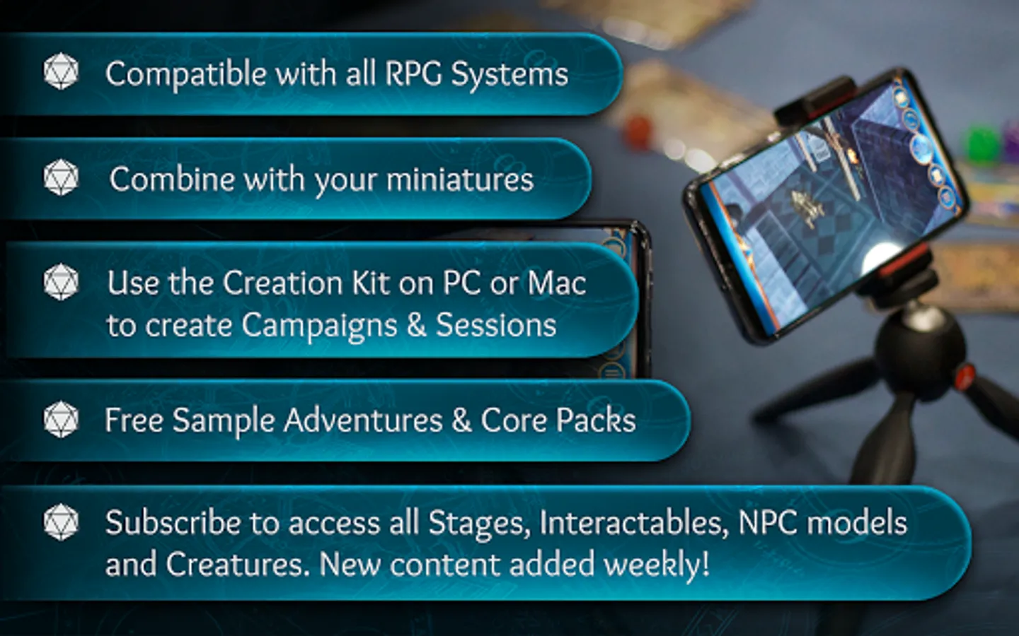 Add something new to your tabletop role playing games with animated creatures, characters, NPCs, scenery, and props. Use the app as a player and see what your character sees or customise your campaigns as a Game Master with the Creation Kit.