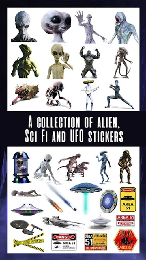 Create a photo montage that will make it look like you entered the higly secretive "area 51". You can do it easily using the stickers from this "Area 51 Alien Stickers" app. With the motto: 'Storm Area 51, They Can't Stop All of Us' visiting the desert on 20 September has become a trending topic, and if don't want to risk going, use the alien stickers from this area 51 camera to make a fun photo montage with aliens. Or, if you want to freak someone out about spotting a UFO, this area 51 app is also a fun ufo in photo editor with photo stickers free.