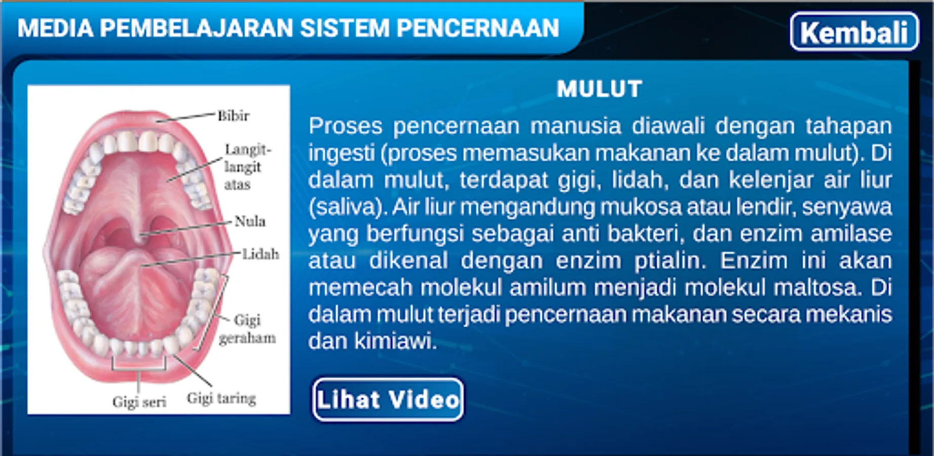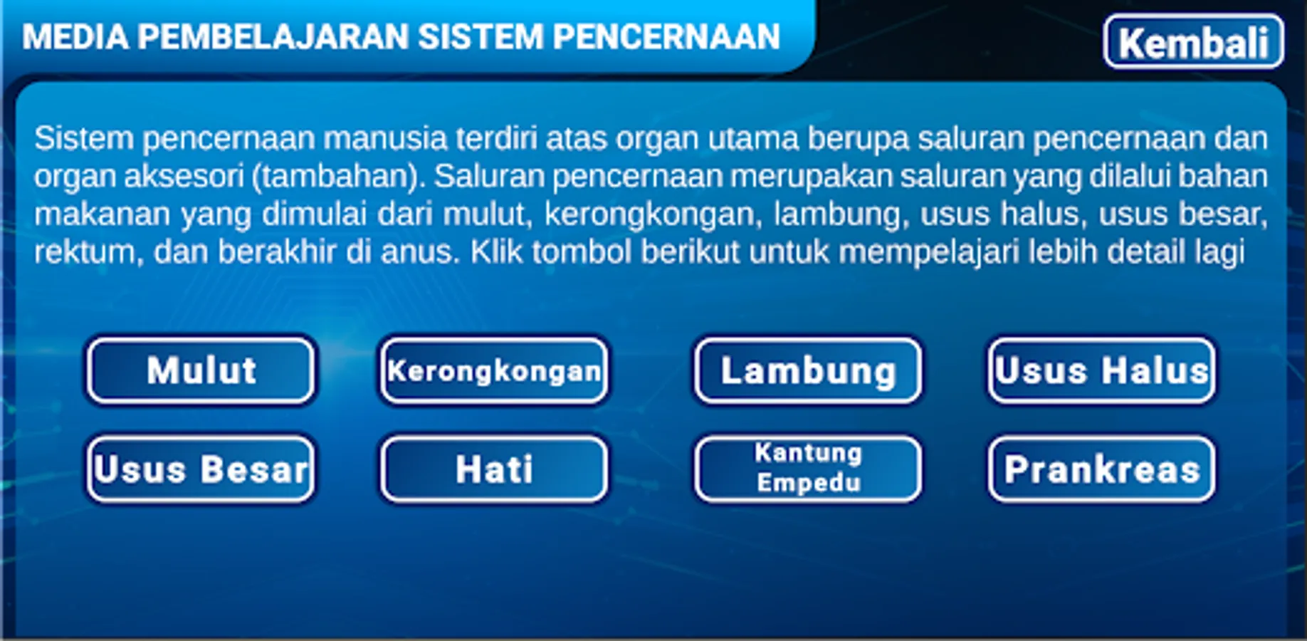 The digestive system is an important part of the human body that allows us to digest food, absorb nutrients, and excrete unused waste. Understanding the digestive system is very important in education and understanding about health. To increase this understanding, the development of learning media applications based on augmented reality (AR) has become an interesting innovative approach. On this page, we will explain more about the AR-based digestive system learning media application.