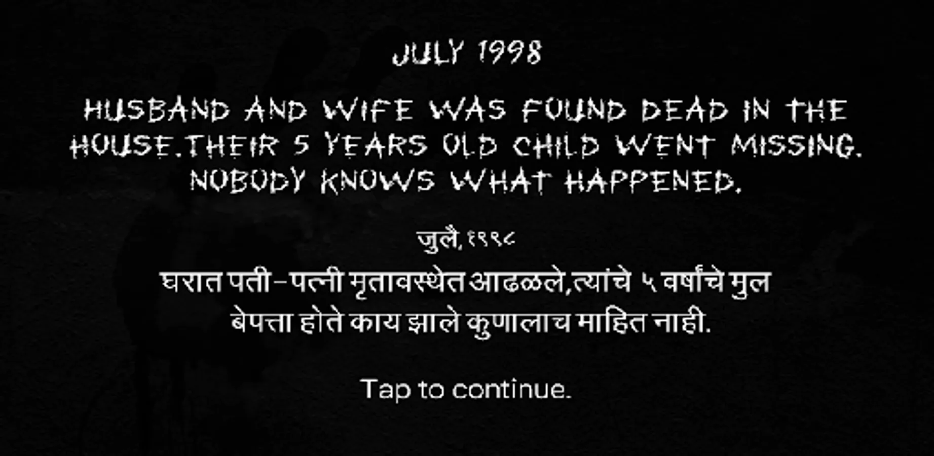 You are having nightmares of your past events. You are seeing same house in every nightmare. The husband and wife found dead inside the house and their 5 year child went missing. People say that the house is haunted. You came here to find out what happened in this house, to get rid of your Nightmares.