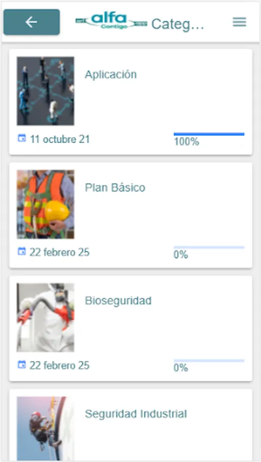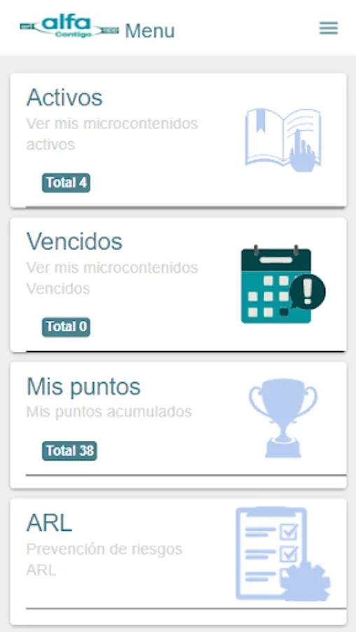 arl alfa with you app has a traditional login system, once you enter the application with your user, you can navigate between the different active courses in which you are enrolled, the application has multimedia and audiovisual content, as well as short evaluations, all this segmented by categories within the different courses.
