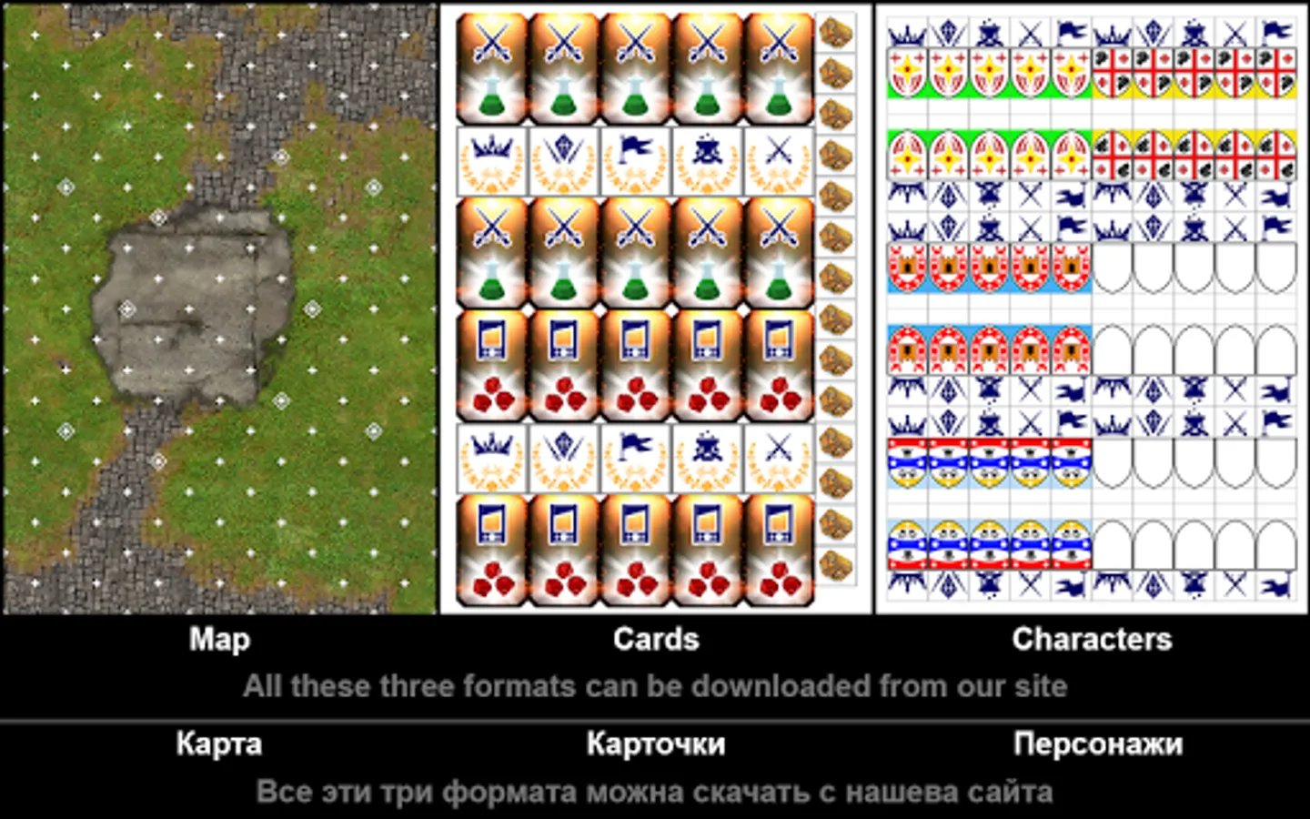 The game is designed for table games. Play with real people "Strategy" in real time. Characters and maps can be downloaded from our website and printed on an ordinary color camera. Paper size is A4 format.