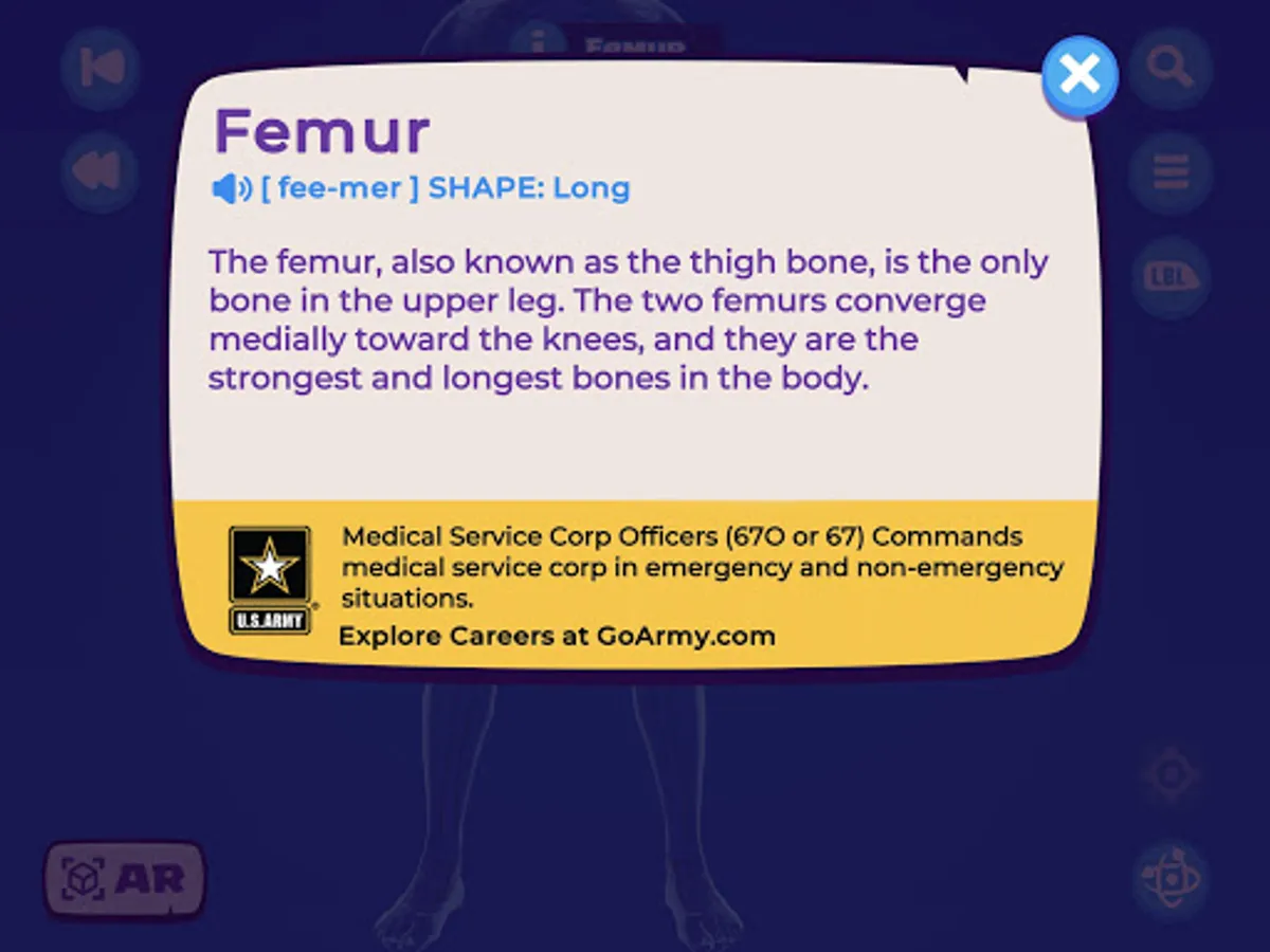 U.S. Army STARS Anatomy is a fun and exciting way to learn about the bones in the body. Explore the human skeleton with an interactive 3D model on your screen, or using Augmented Reality place it in your world! Quiz yourself in challenge to test your knowledge and reinforce your memory. Play our game to have some fun discovering the bones in the human body alongside the Tinysaurs. Anatomy is great for students, teachers, and anyone interested in the skeleton.
