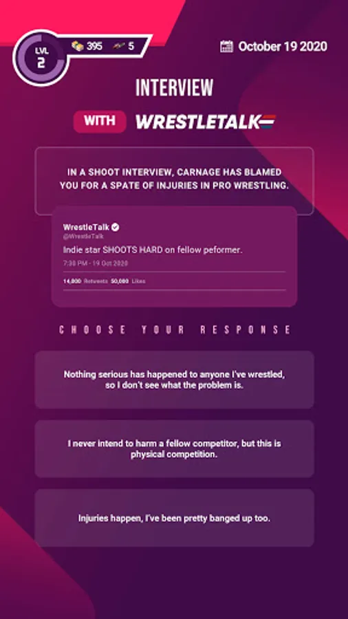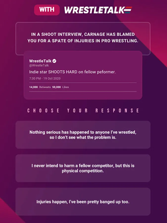 Indie Wrestler is a tap based text mobile game; made by wrestling fans for wrestling fans. The idea behind it is pretty simple – we wanted to give you the opportunity to create a character and take them to the top of the wrestling world.