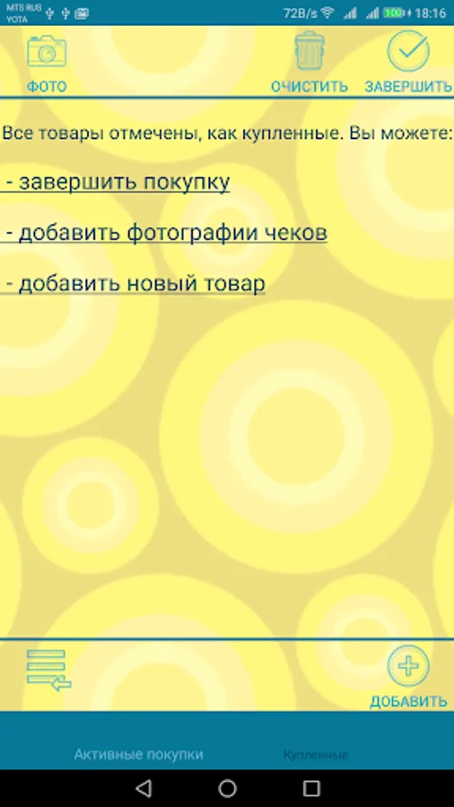 A mobile assistant where you can store your planned purchases so you don’t forget to buy something. There are sections for the next trip to the store, as well as notes for goods that will need to be bought soon. There is a special section where you can group purchases and track their progress. Upon completion of the purchase, you can add photos of receipts and indicate the store where the purchases were made. The last 10 campaigns can be saved in history and, if necessary, viewed.
