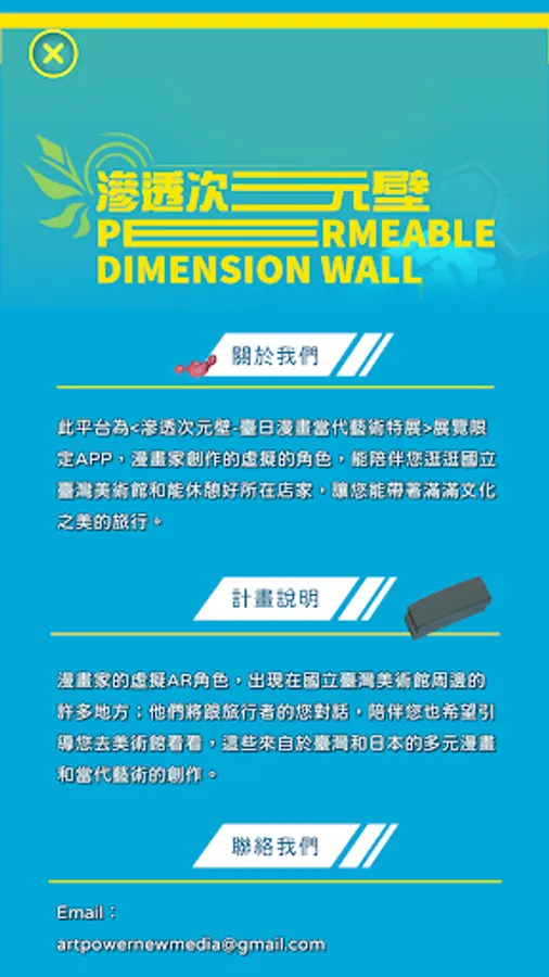 This app is free for the public to download and use, and to visit the exhibition "Penetration Dimensional Wall" for free. It is made with a deeper understanding of the works of cartoonists in the comic ecosystem that started from the Internet and the aesthetics of Taiwan and Japan. In this exhibition, the "Comic Ecosystem from the Internet", the dimensions of the comic ecological coordinate system are extracted through the method of topology and "continuous mapping". The vertical axis is the "historical dimension" and the horizontal axis The part of is the "structural dimension". Let’s rethink the intersection of Taiwan and Japan’s animation culture in the present, and also think about the next step and possible outlook of Taiwan’s comics in the future.