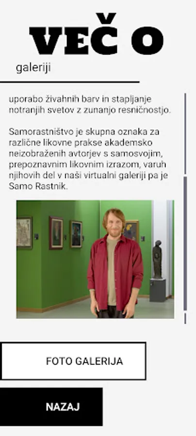 In the GLST Virtual Guide application, Samo Rastnik, the guardian of works of art in the gallery, presents a lot of interesting things about the Camps, their origins and history, the participating artists and various events in the gallery. You will learn a lot of new things, you can see a gallery of old photographs from the Camps and try your hand at each of the three gallery sets in search of a work of art created in one of the interesting art techniques.