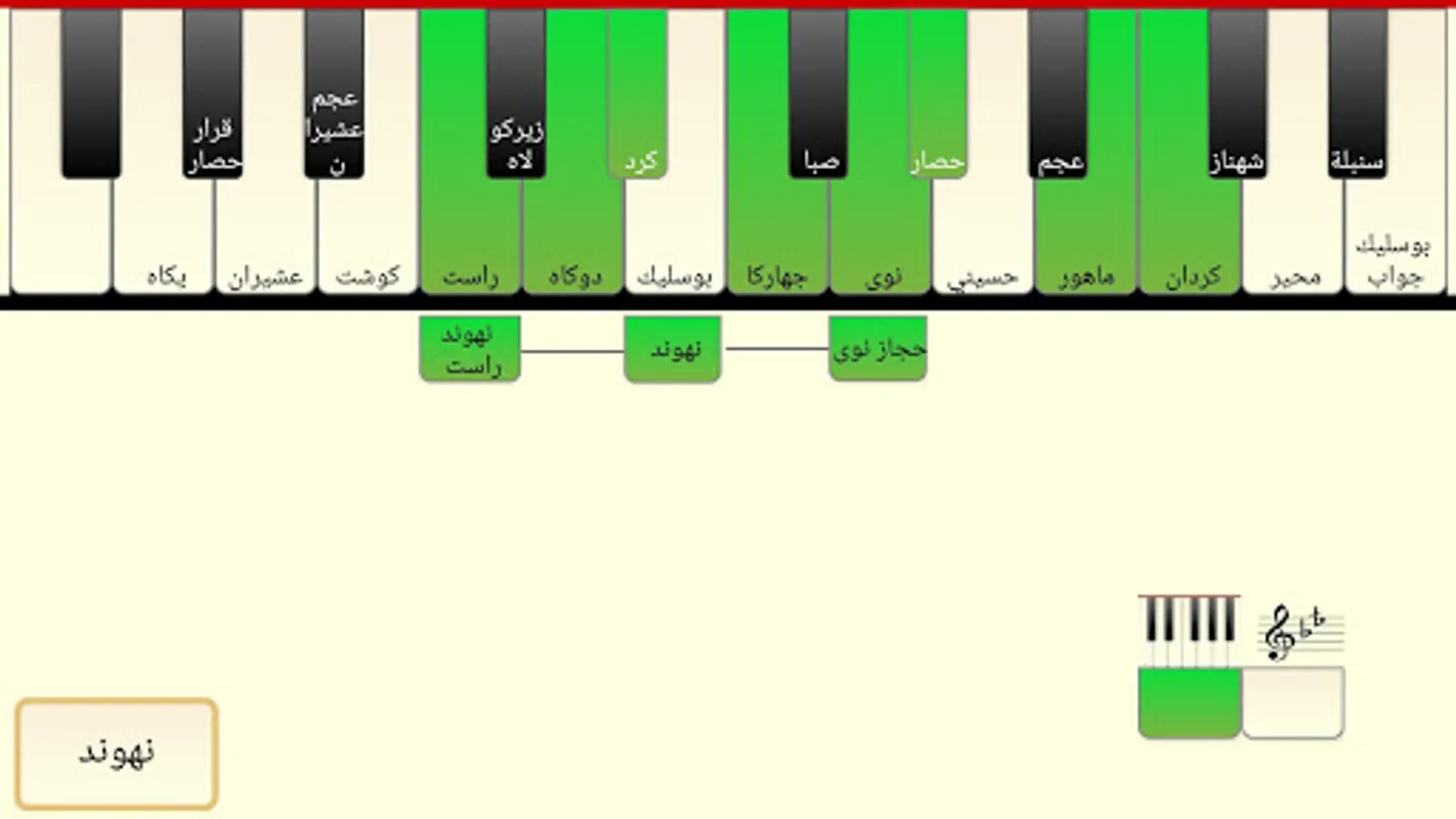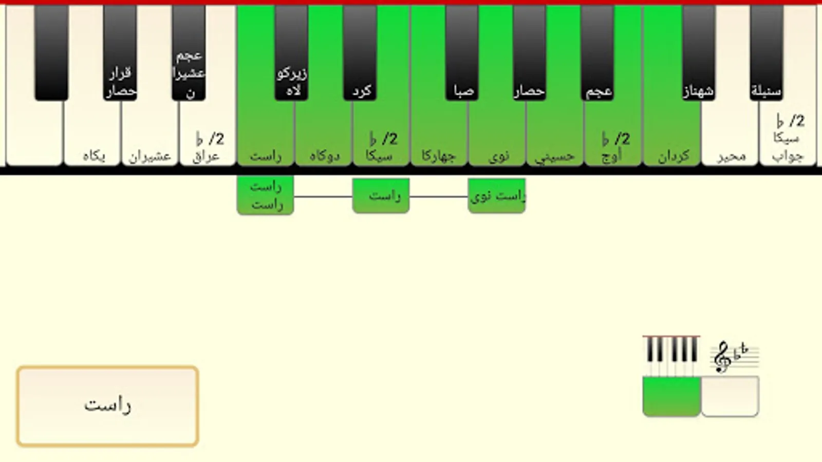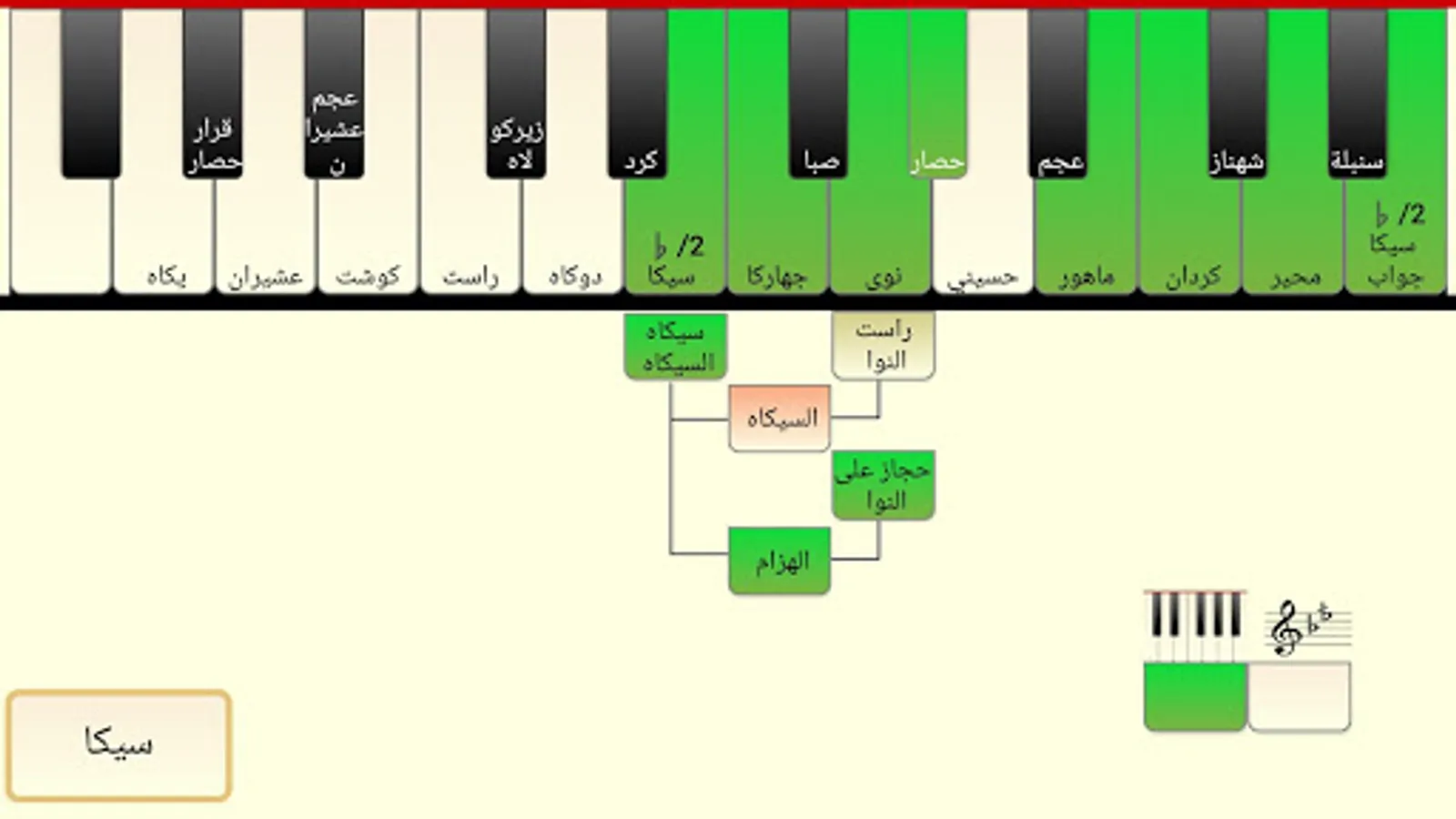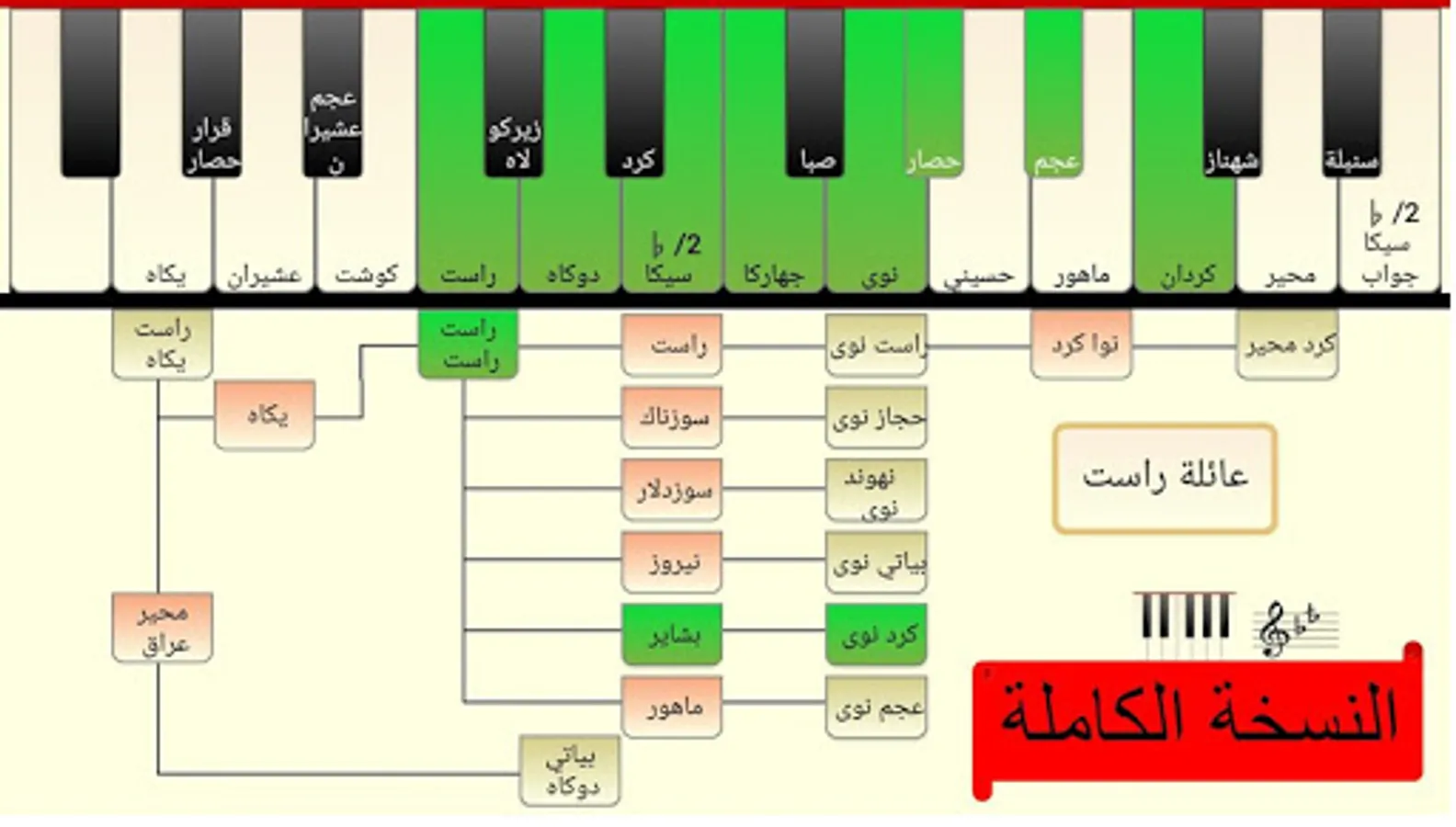 In this application you leatrn oriental scales Rast, Ajam (major), Hijaz, Nahwand (minor), Saba, Hijaz, Sika, kord.