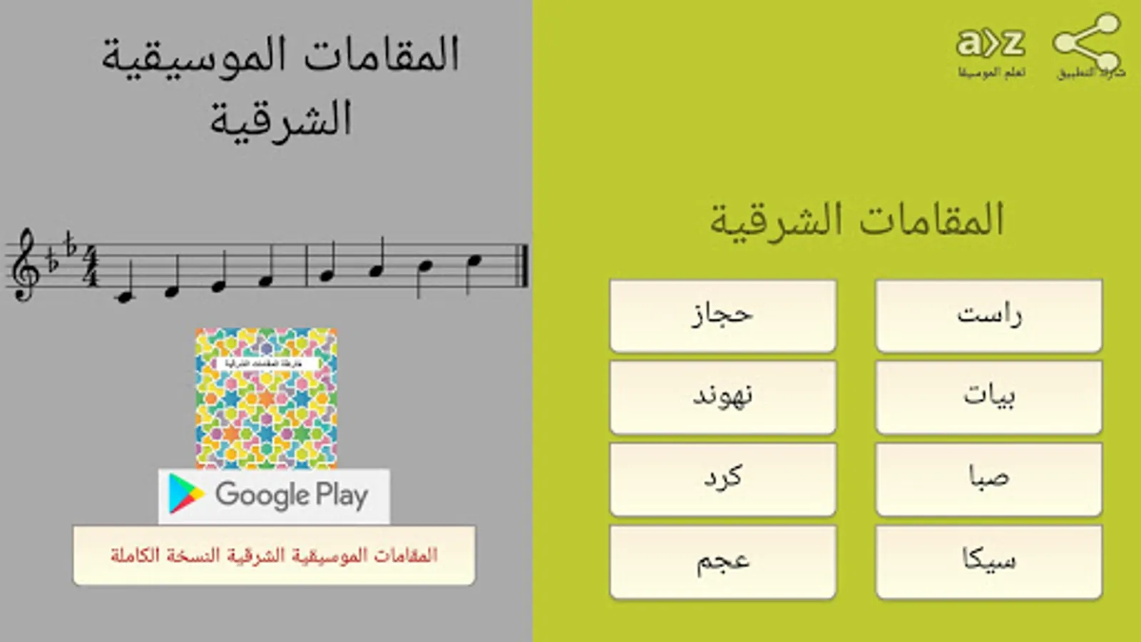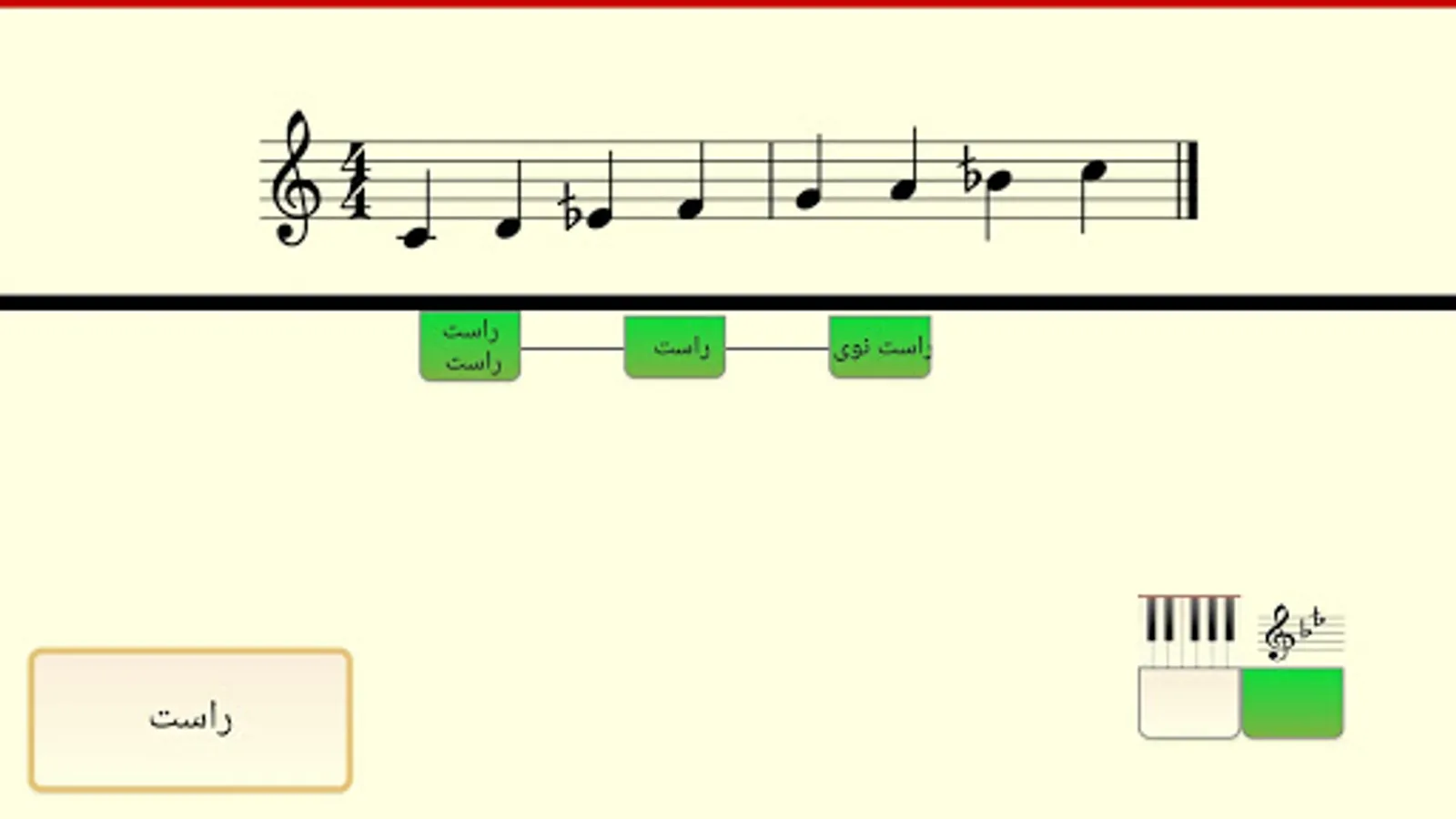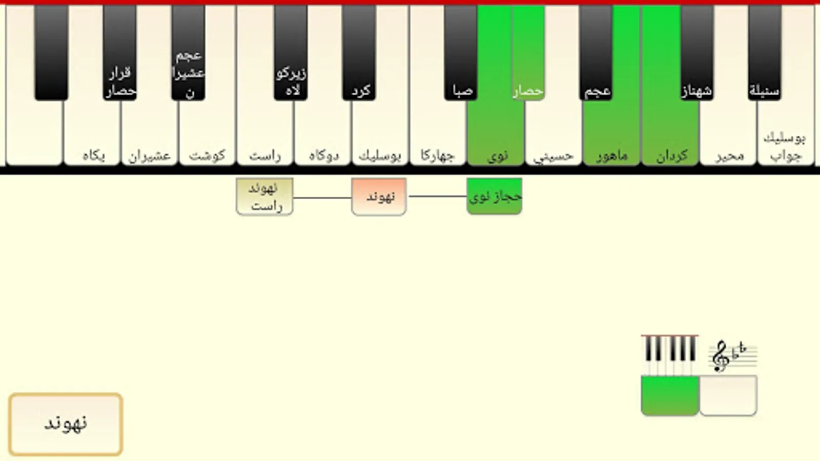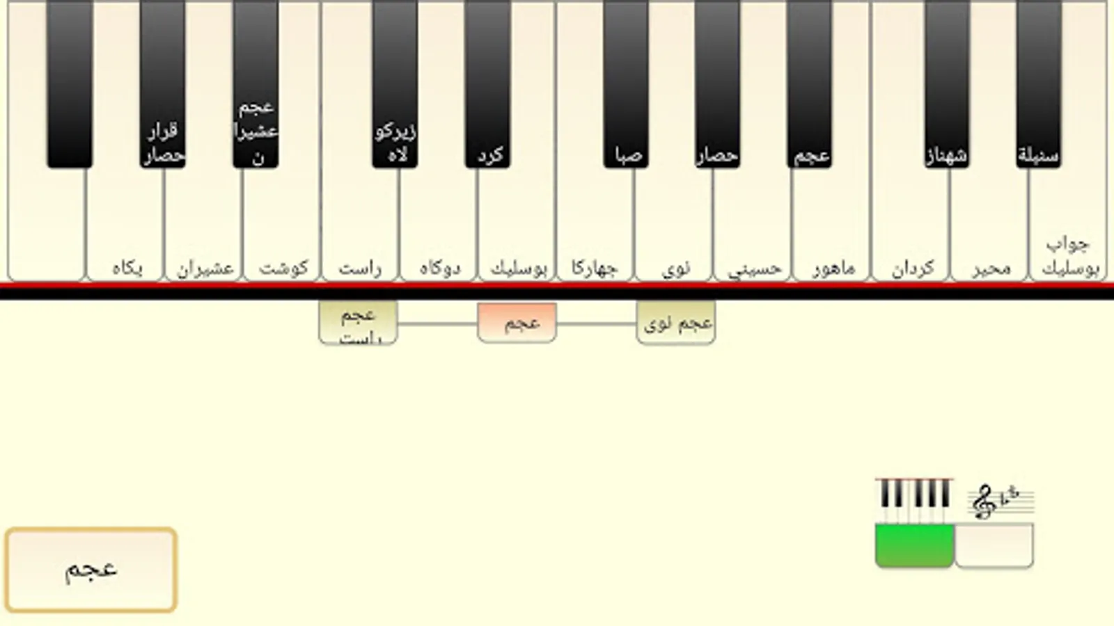 In this application you leatrn oriental scales Rast, Ajam (major), Hijaz, Nahwand (minor), Saba, Hijaz, Sika, kord.
