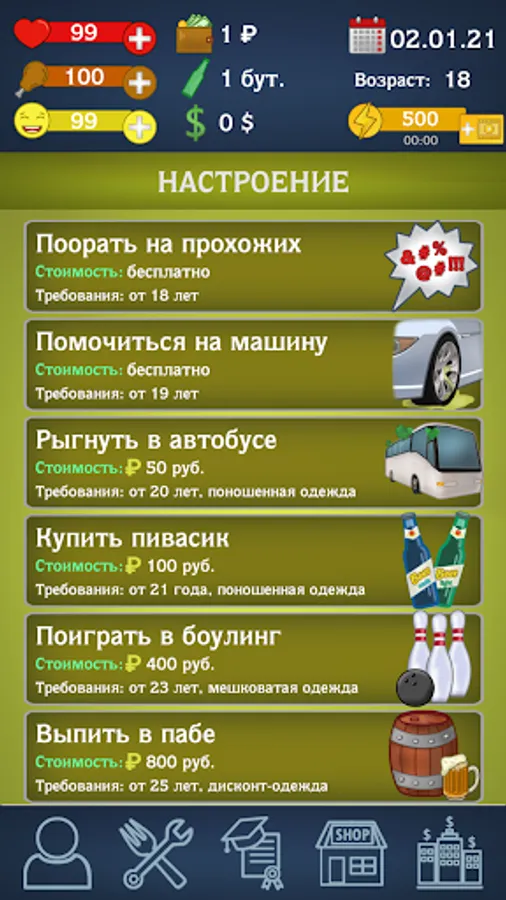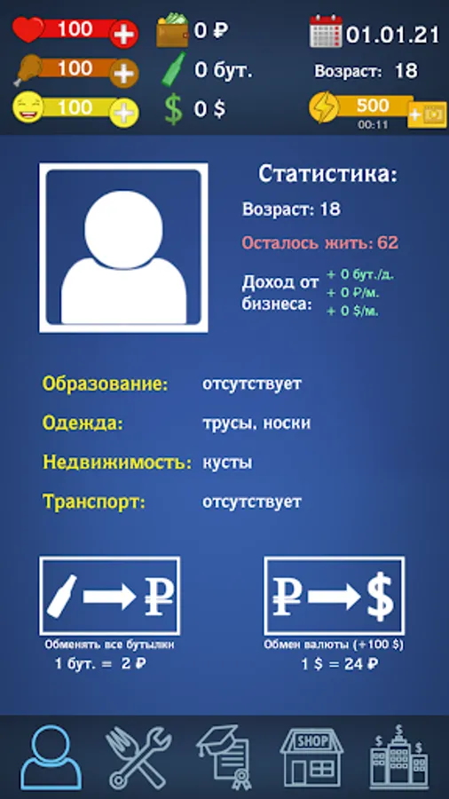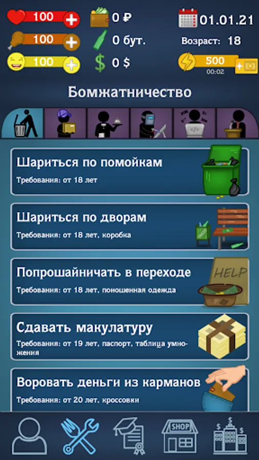 At the beginning of the game in this simulator, you will have no money, no documents, no education. Start collecting and handing over bottles, look for modest housing, learn the multiplication table and go from a homeless person to a respected person!