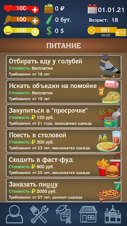 Start your survival quest! Fight for your life - maintain your health, hunger and mood are always in good shape, otherwise you will lose everything! Steal food from pigeons, eat from the garbage, sleep on benches in parks, yell at passers-by! Do everything to survive and it will be rewarded to you!