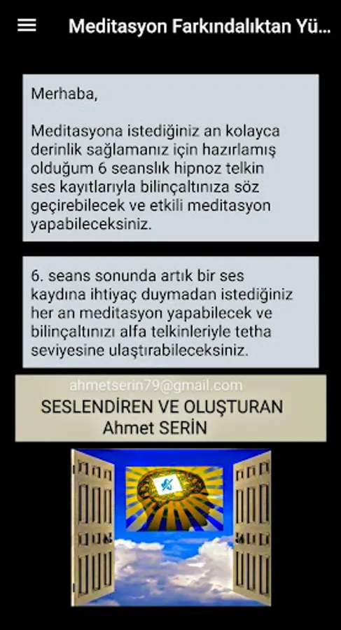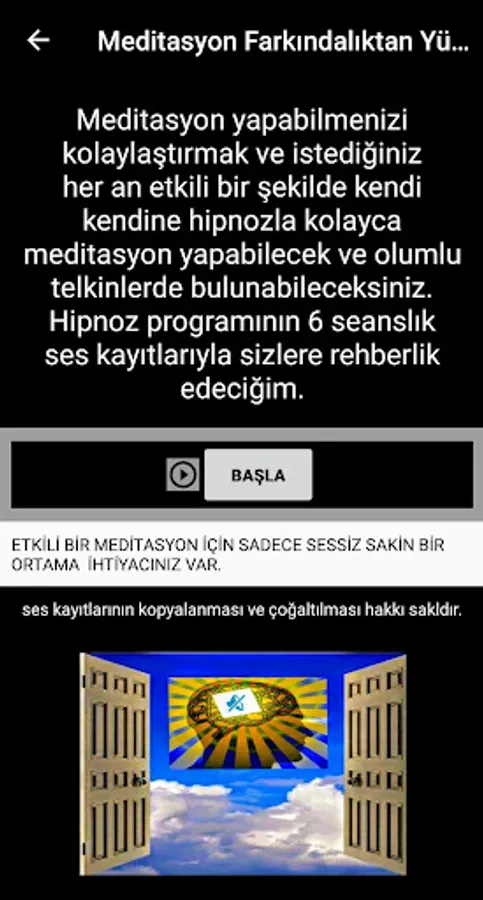 Meditasyon Farkındalıktan Yüksek Bilince 4.0 uygulamasıyla kendi kendine hipnoz programının 6 seanslık ses kayıtlarıyla bilinçaltınızın giriş anahtarına sahip olabilecek ve 6 seans sonunda artık bir ses kaydına gereksinim duymadan kendinize olumlu telkinler verebileceksiniz.