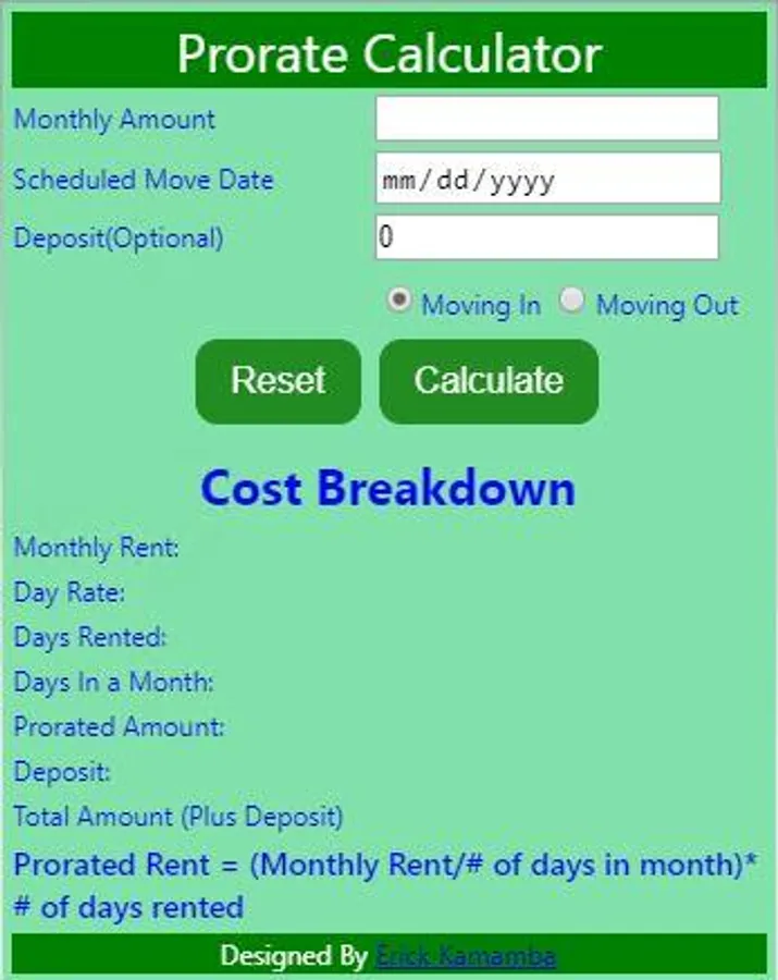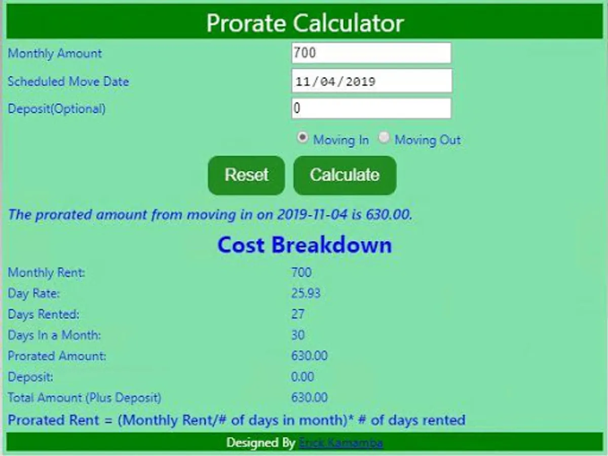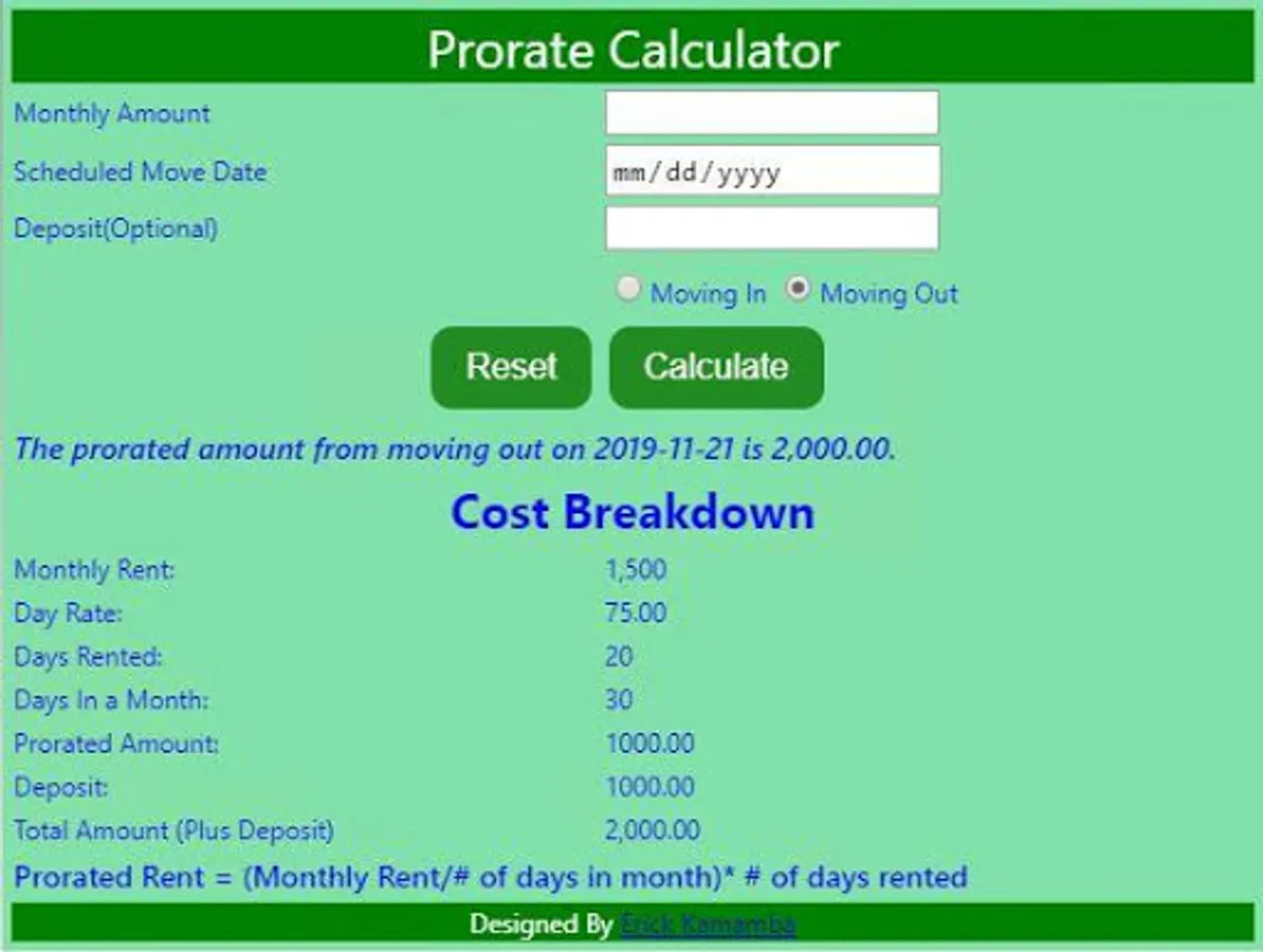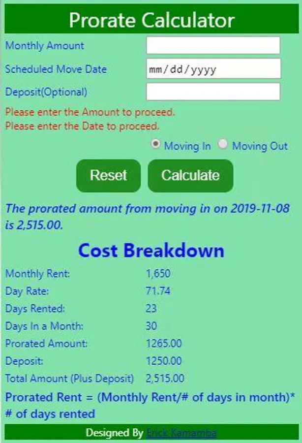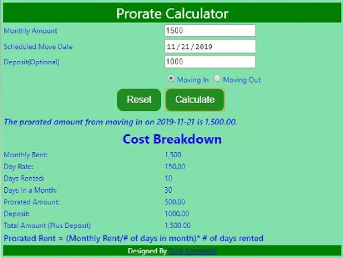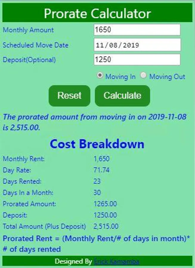 This calculator calculates amount of service provided based on the monthly rate. For instance a prorated rent is the amount a tenant is charged for the number of days they occupy the unit, based on the monthly rent