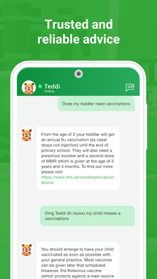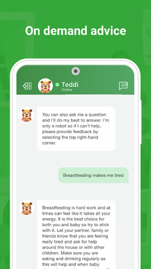 Teddi is your early years (0-5) robo-support. Raising a child can be really tough and the early years between 0-5 are formative. Teddi is there for you with advice and support to empower you to give your child the best start in life. Teddi has been built on evidence-based data, resources from trusted sources, knowledge from key subject matter experts, insights from large teams of Health Visitors and School Nurses, parenting expertise, user feedback, and advances in AI to be there for you at any time. You can have a general conversation with Teddi, ask Teddi questions, or talk about issues or concerns you may have.