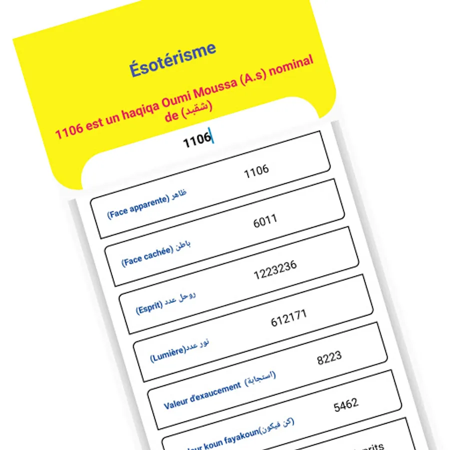 5) #Numérologie Coranique (Partie vous donnant l'aperçu sur le statistique du coran à savoir le (nombre de versets,nombre de hourouf, nombre de kaalmat,le poids mystique Oriental et le poids mystique occidental etc etc..)