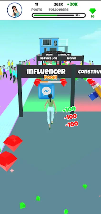 Get to the end of the road and try to collect as many money bills, gems and stars as possible along the way! Use your swiping skills to get millions of followers!