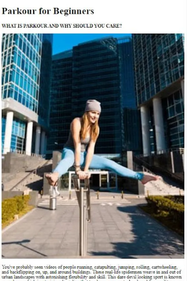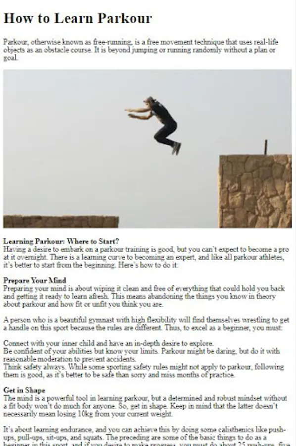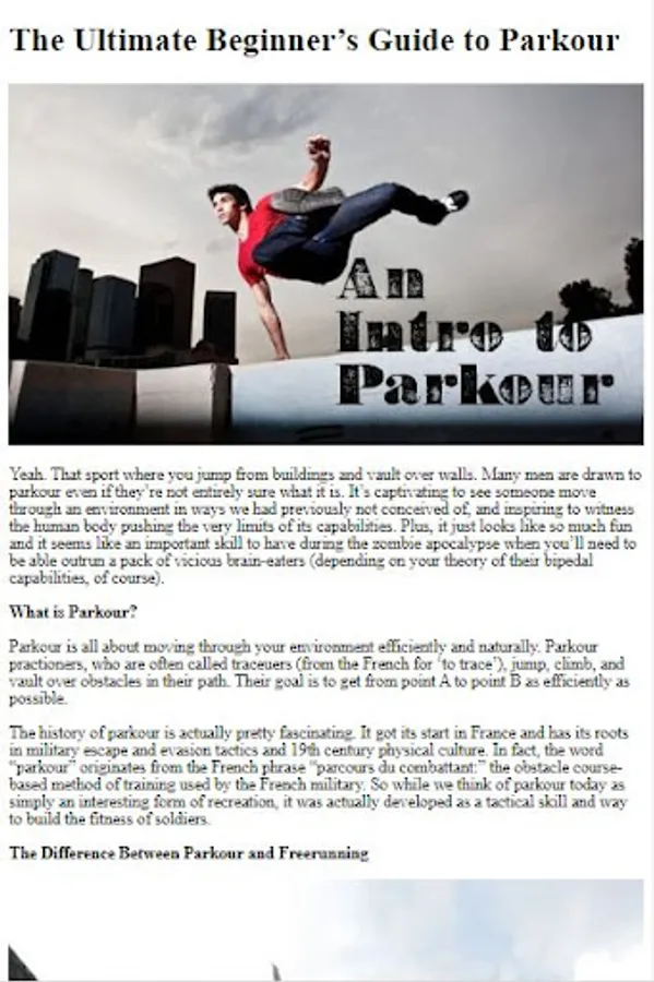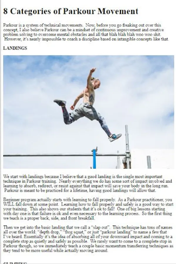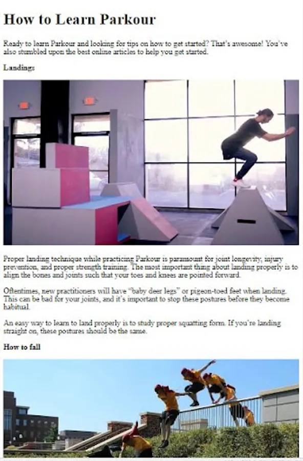 Whether you're a curious beginner intrigued by the art of parkour or an aspiring traceur looking to elevate your skills, "Parkour Moves Masterclass" is designed to make your journey engaging, empowering, and accessible. With an intuitive interface and step-by-step tutorials, we're committed to helping you master the art of parkour moves with confidence and agility.