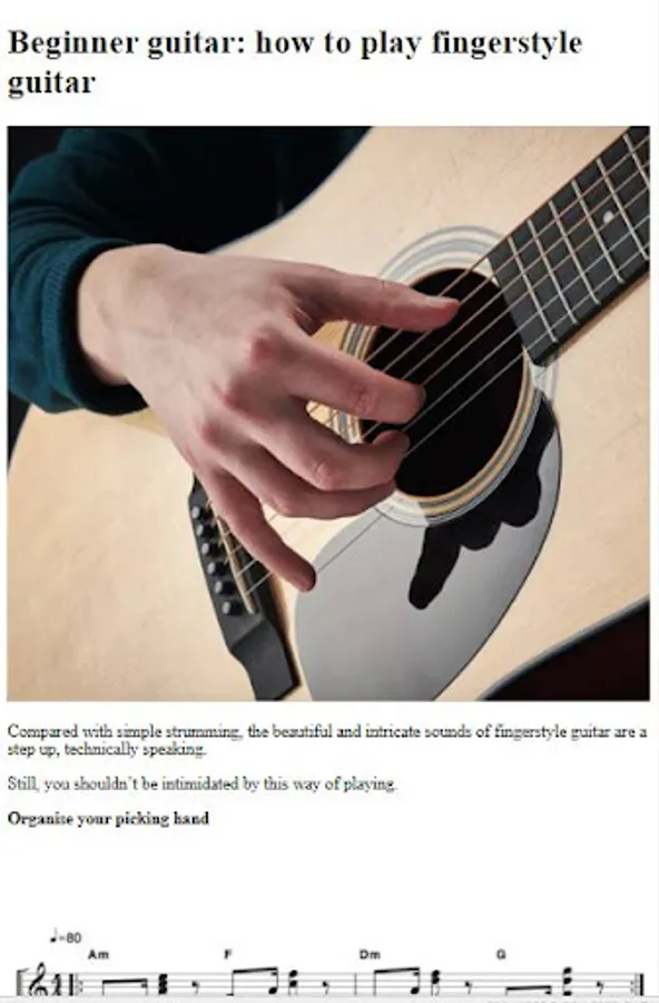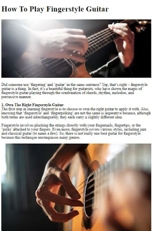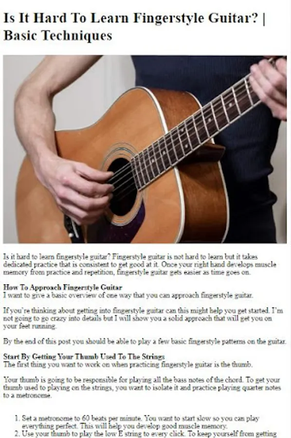 Welcome to "Fingerstyle Guitar Mastery," your gateway to exploring the mesmerizing world of fingerpicking, mastering intricate techniques, and becoming a skilled guitarist who can create captivating melodies and rhythms with your fingertips. Are you ready to embark on a musical journey that lets you harness the power of fingerstyle guitar playing, express yourself through beautiful melodies, and become a confident guitarist who can evoke emotions and captivate audiences with your unique style, all while embracing the joy of musical expression? Look no further – our app is here to guide you on an inspiring path through the realm of fingerstyle guitar mastery.