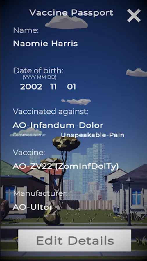 This app serves as vaccination proof against one of the 4000 strains of the Zombie virus AO-ZV22.