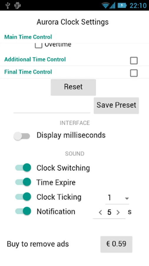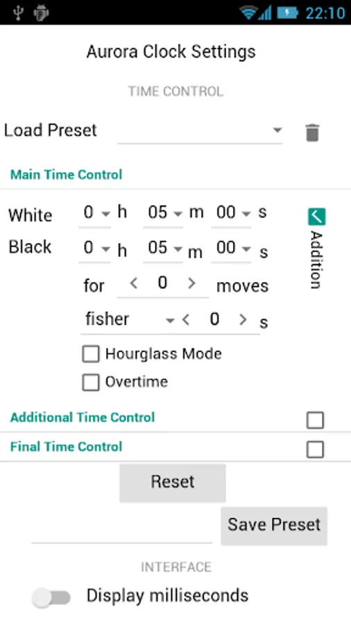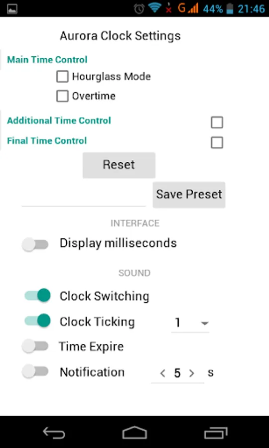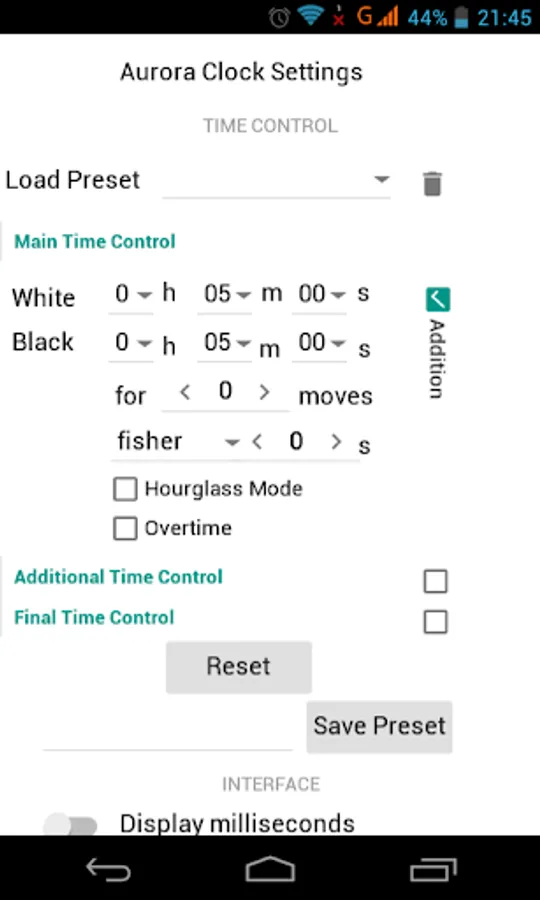 Aurora Clock is a tool that allows you to turn your Android smartphone or tablet into a professional tournament clock for chess, checkers, go, othello or any other board game for 2 players. The application has an appearance of classic digital clock. It supports up to 3 game stages with different settings for each. By combining time options you can set almost any time control.