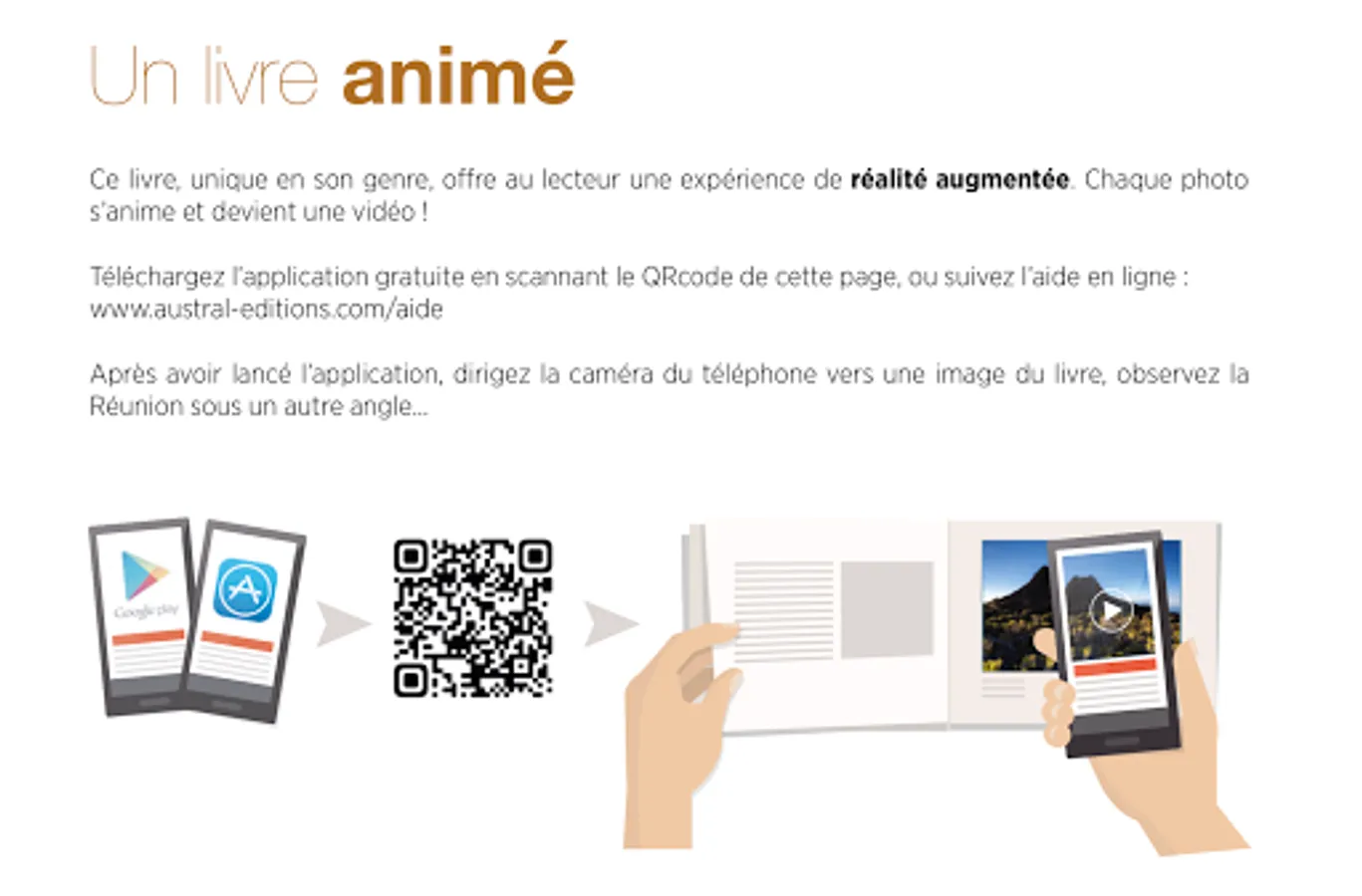 This application allows the holders of the works of "Austral Editions", to experience unique augmented reality. Each image of the books of "Austral Éditions" in augmented reality, is animated by a short video, which takes the place of the printed image. It is a single application for all works.