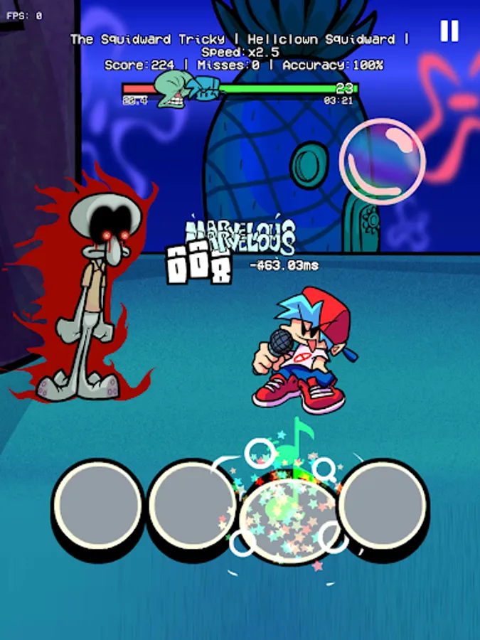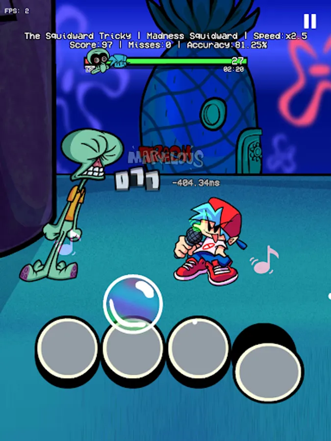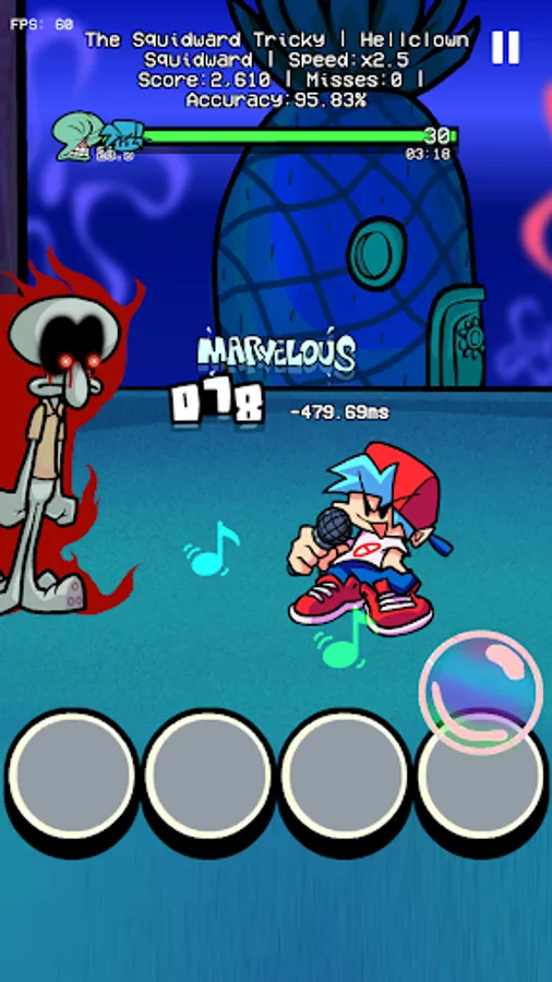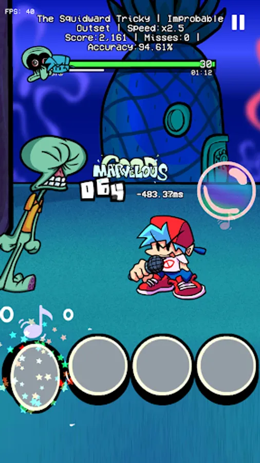 Boyfriend has just come to the bottom neighborhood of the FNF underwater city last Friday and settled next to the special squid neighbor whose name is Squidward. BF thought that he was very kind, so BF ran to Squidward's house begging for help at night. As he was knocking the door, Squidward opened the door when BF was still knocking, causing his eyes and nose to sink into his head. Oops! Maybe that is the main reason for this funkin madness combat.
