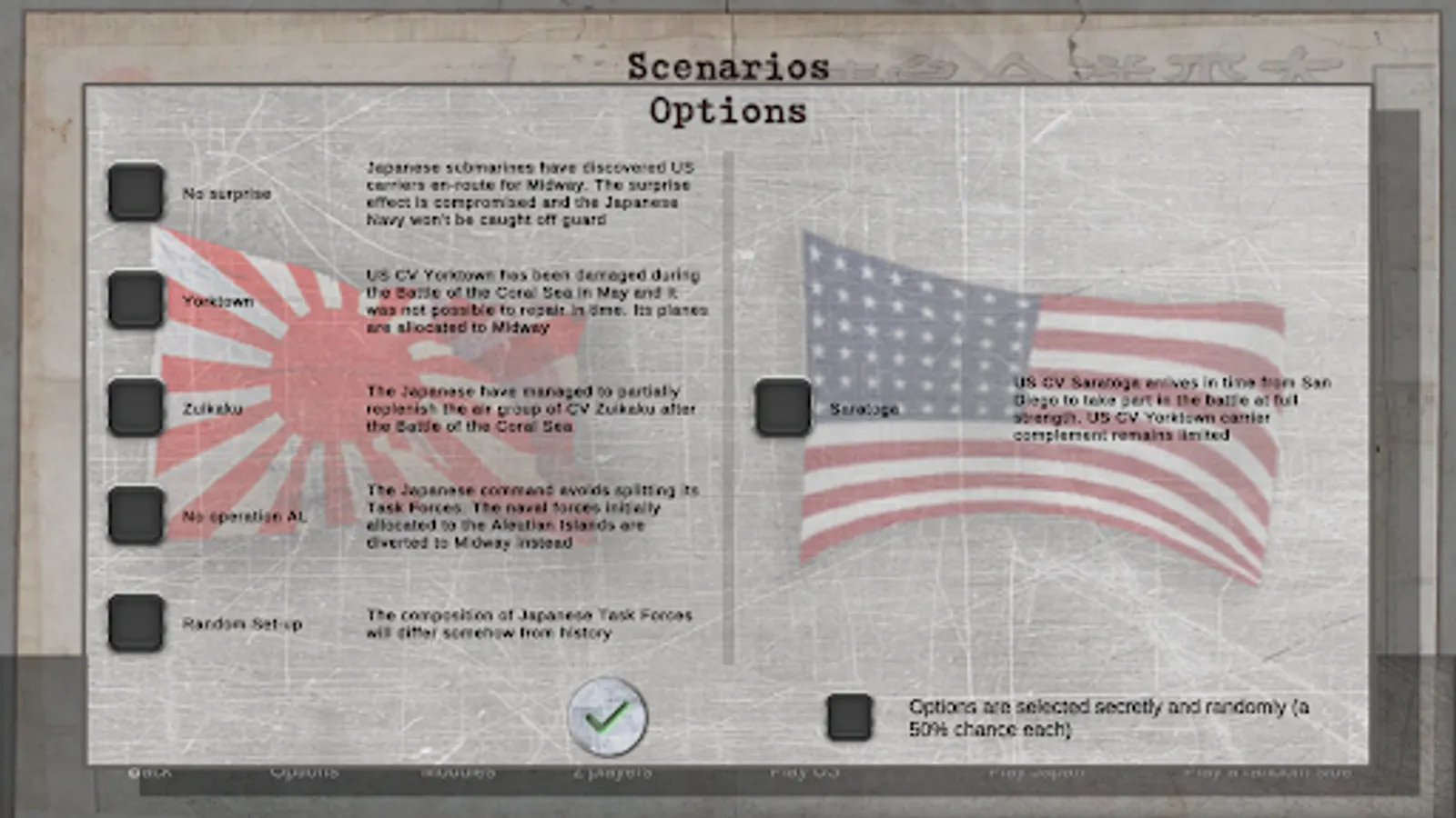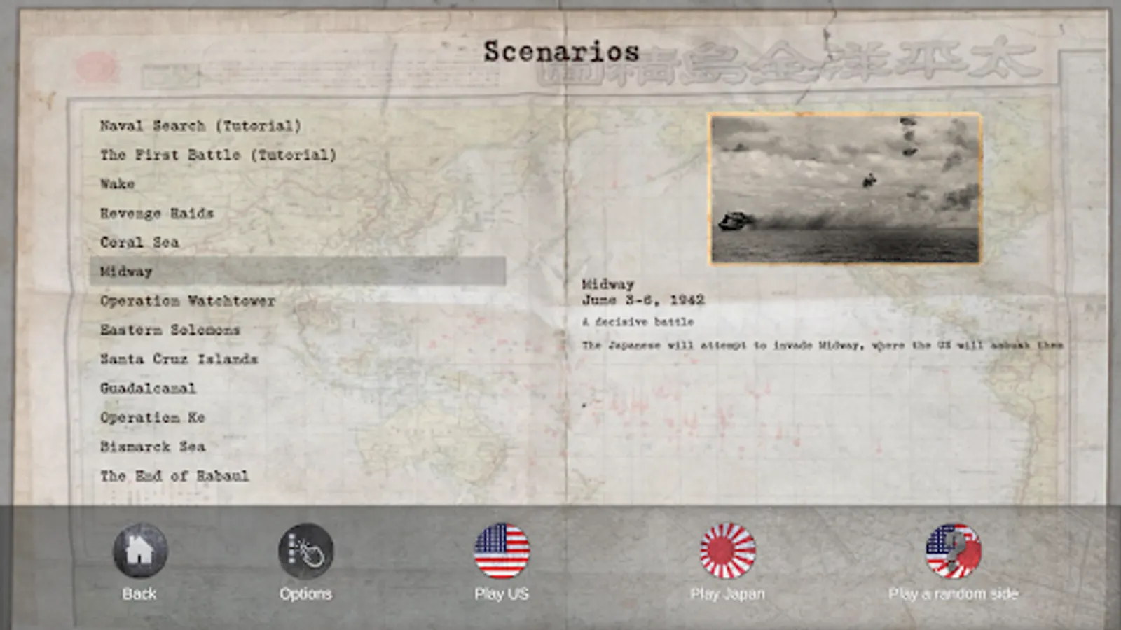 • 11 historical scenarios: Coral Sea May 42, Midway June 42, Eastern Solomon Aug 42, Santa Cruz Oct 42, Guadalcanal Dec 42, Bismarck Sea March 43, Rabaul 1943, Operation Ke Feb 1943, Watchtower Aug.42, US Raids Mar 42, Wake Dec 41