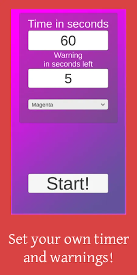 With FitnessTimer you can set your own time and create a warning when the time is almost up. Get a warning and time's up notification to know exactly when the timer has ended!